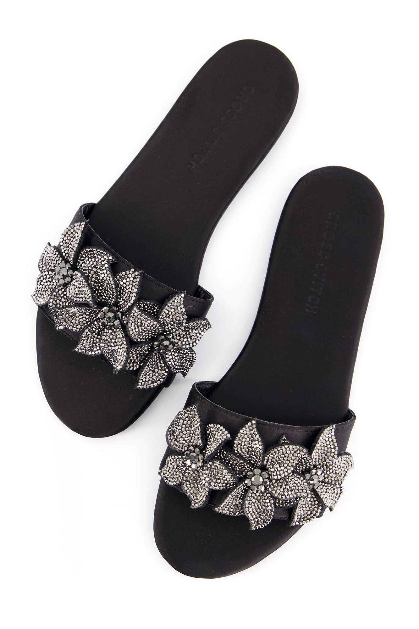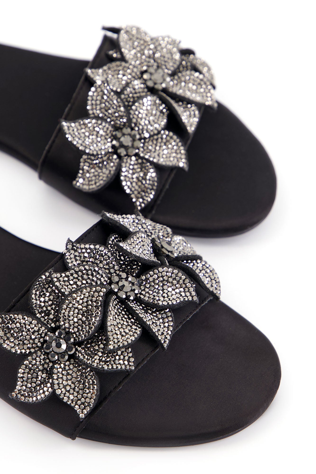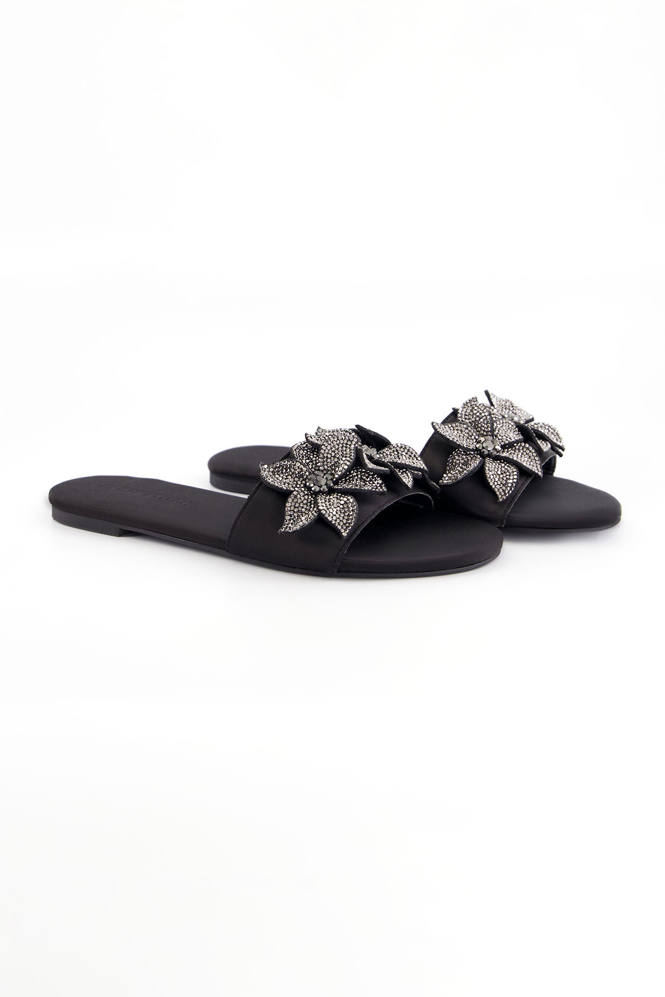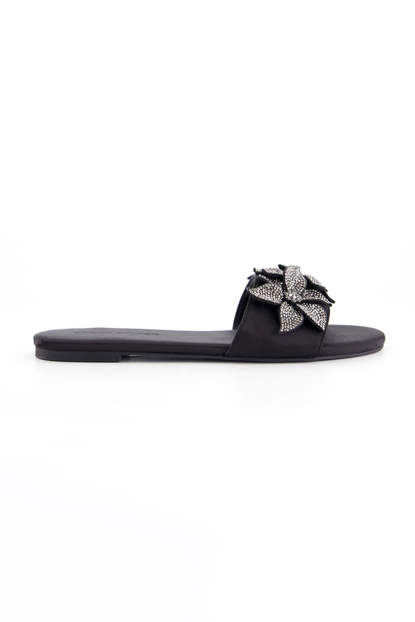 Designed with statement floral embellishments, these flats bring elegance and sparkle to a refined silhouette. The layered crystal floral design adds texture and a striking visual appeal. Crafted with a PU synthetic upper, the pair offers durability with a sleek finish. The padded insock provides comfort, while the custom sheet outsole ensures stability for everyday wear.
