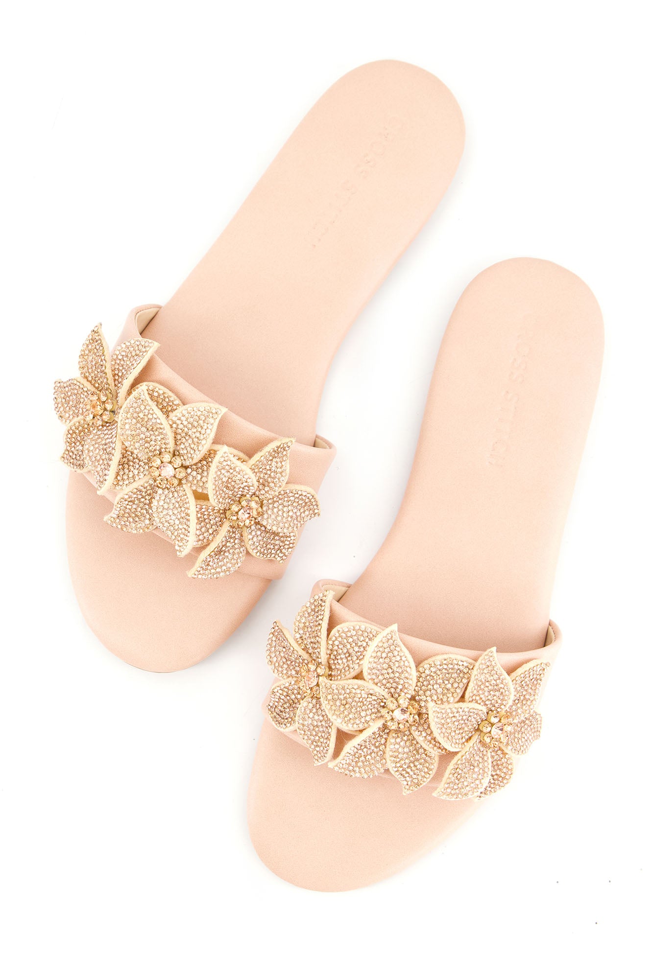 Designed with statement floral embellishments, these flats bring elegance and sparkle to a refined silhouette. The layered crystal floral design adds texture and a striking visual appeal. Crafted with a PU synthetic upper, the pair offers durability with a sleek finish. The padded insock provides comfort, while the custom sheet outsole ensures stability for everyday wear.