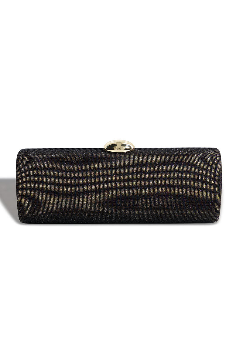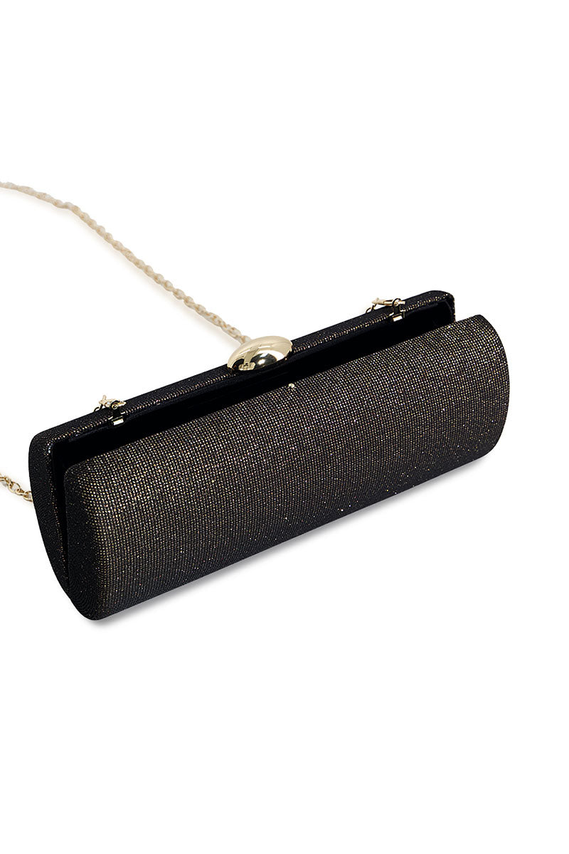 BELLA -1 is a sophisticated black embellished clutch featuring a sleek 9-inch width and 3.7-inch height, complete with an adjustable long chain for versatile carrying options.