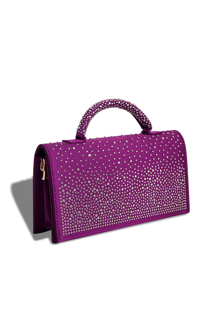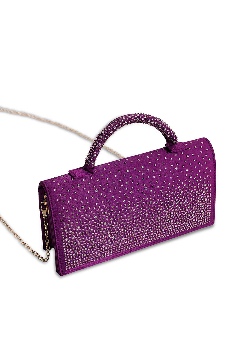 Burgundy embellished handbag with 5" height and 9.6" width, featuring a long chain strap for versatile carrying options.