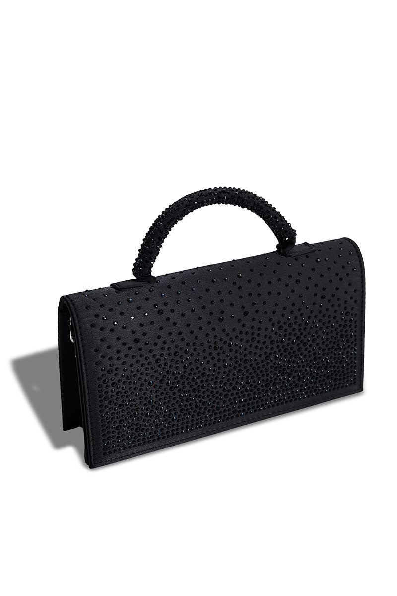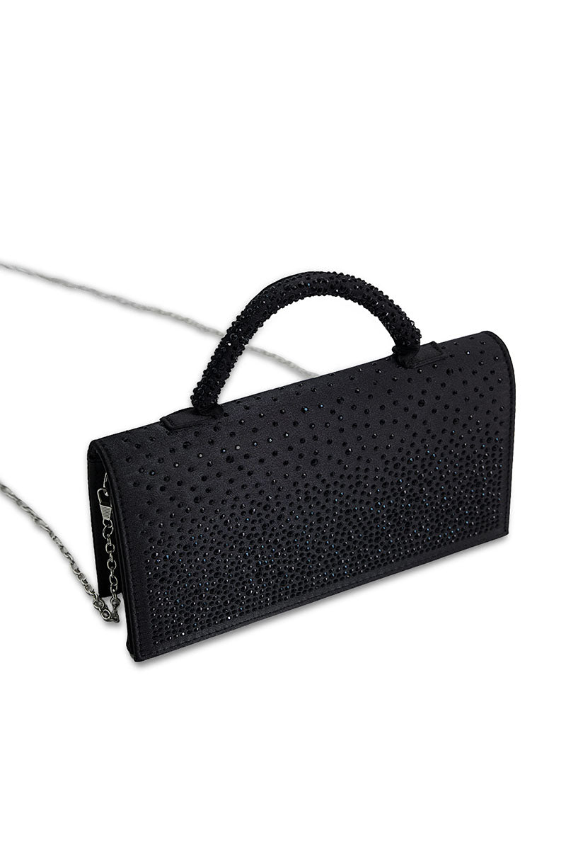 Black embellished handbag with 5-inch height and 9.6-inch width, featuring a long chain strap for versatile carrying options.