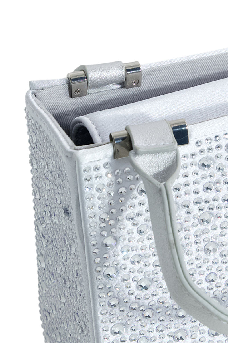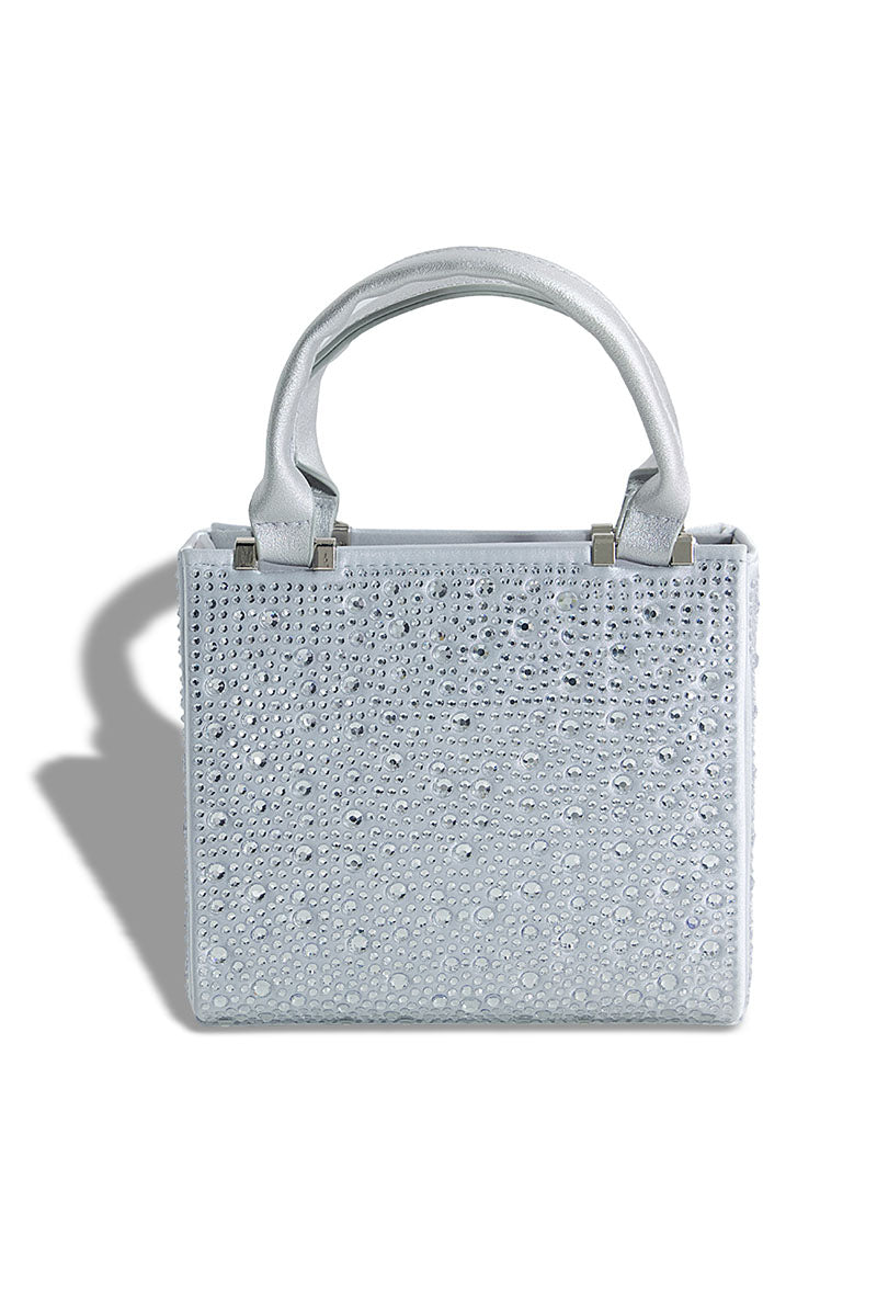 Silver embellished handbag with dimensions of 5.7" height and 6.7" width. A sophisticated accessory designed for refined taste.