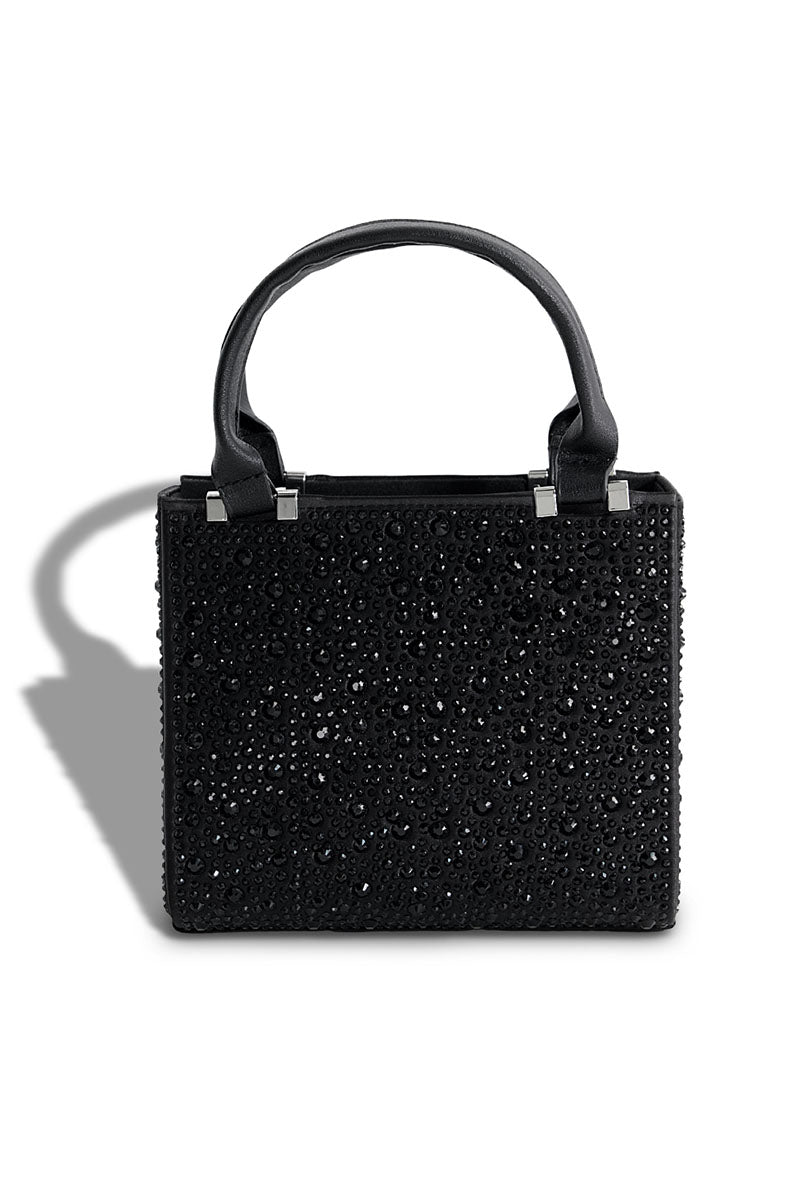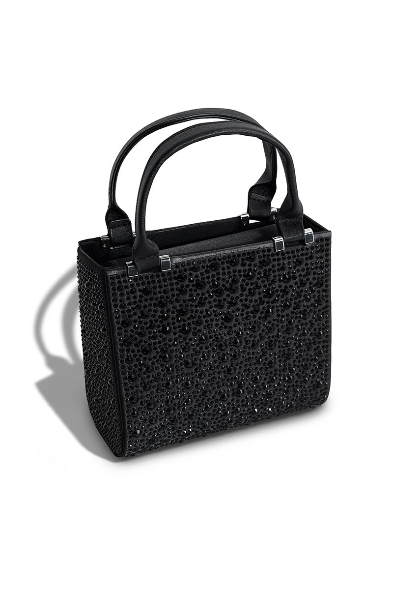 Black embellished handbag with dimensions of 5.7" height and 6.7" width. A sophisticated accessory designed for refined taste.