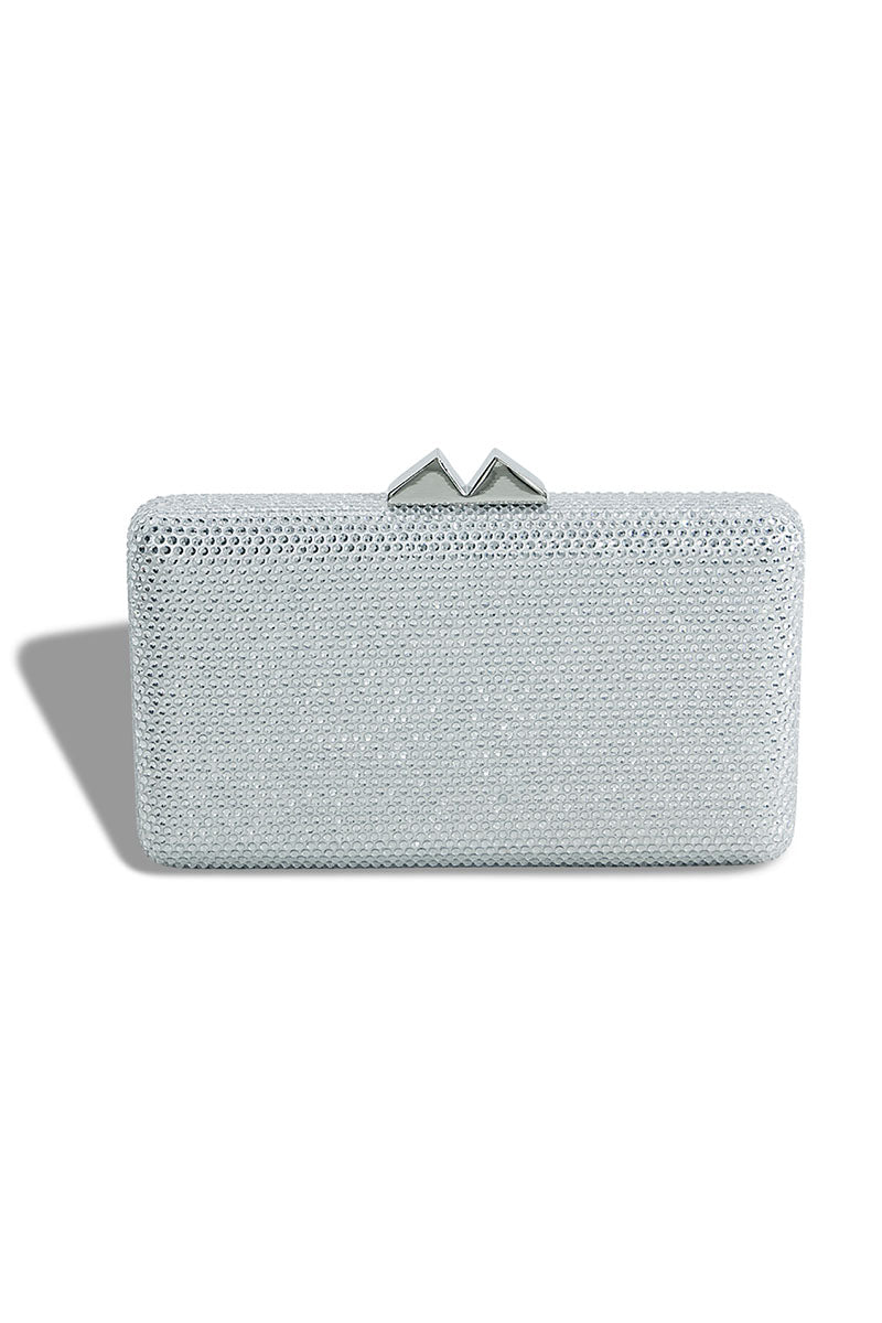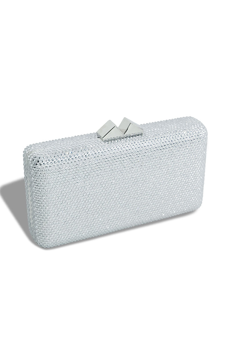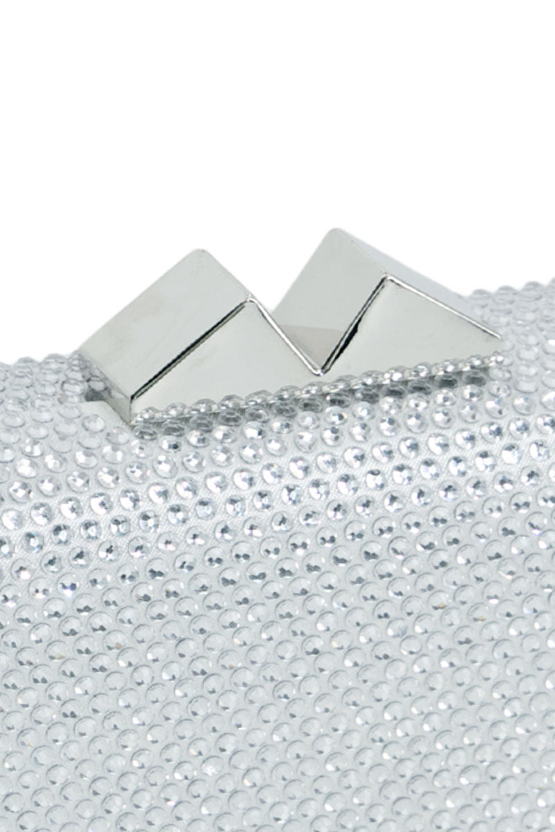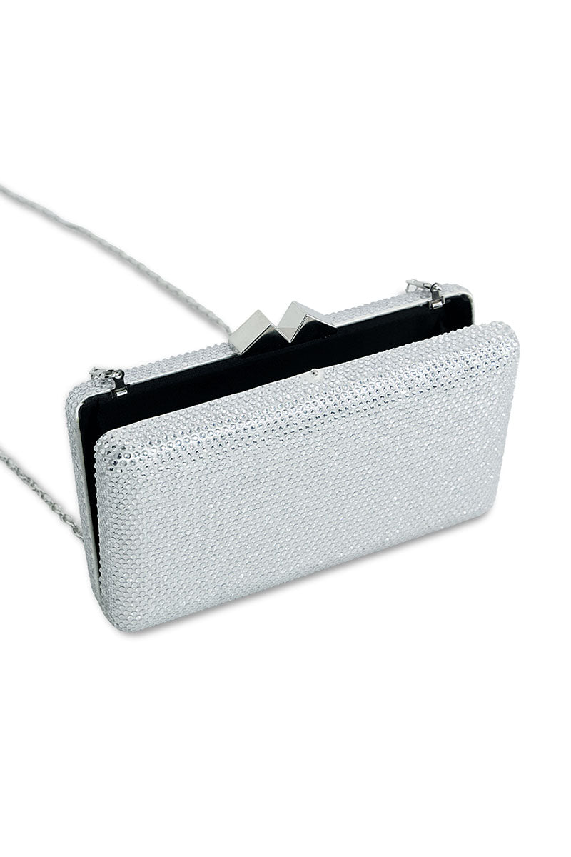 Silver embellished clutch with long chain strap. Compact dimensions (4.8" H x 7.9" W) make it ideal for evening occasions or special events.