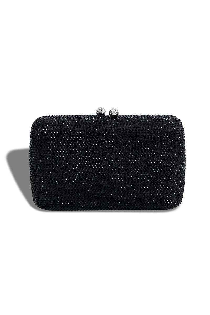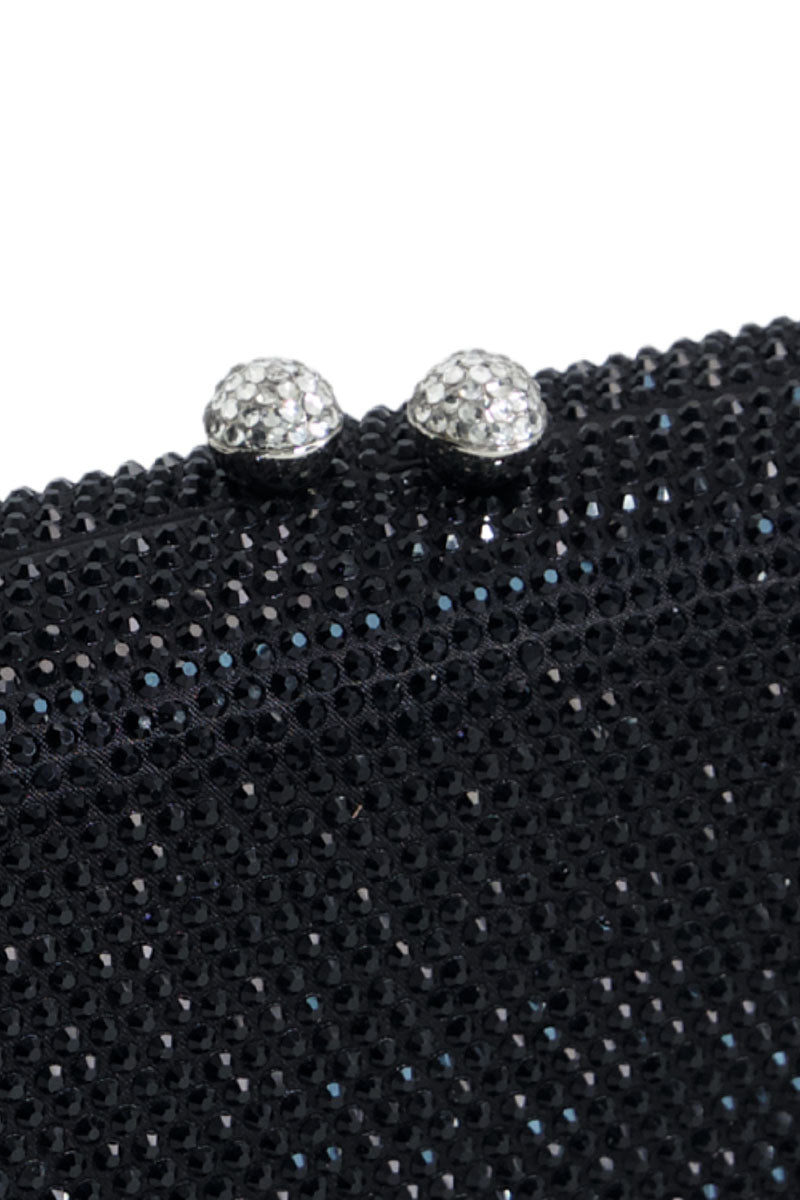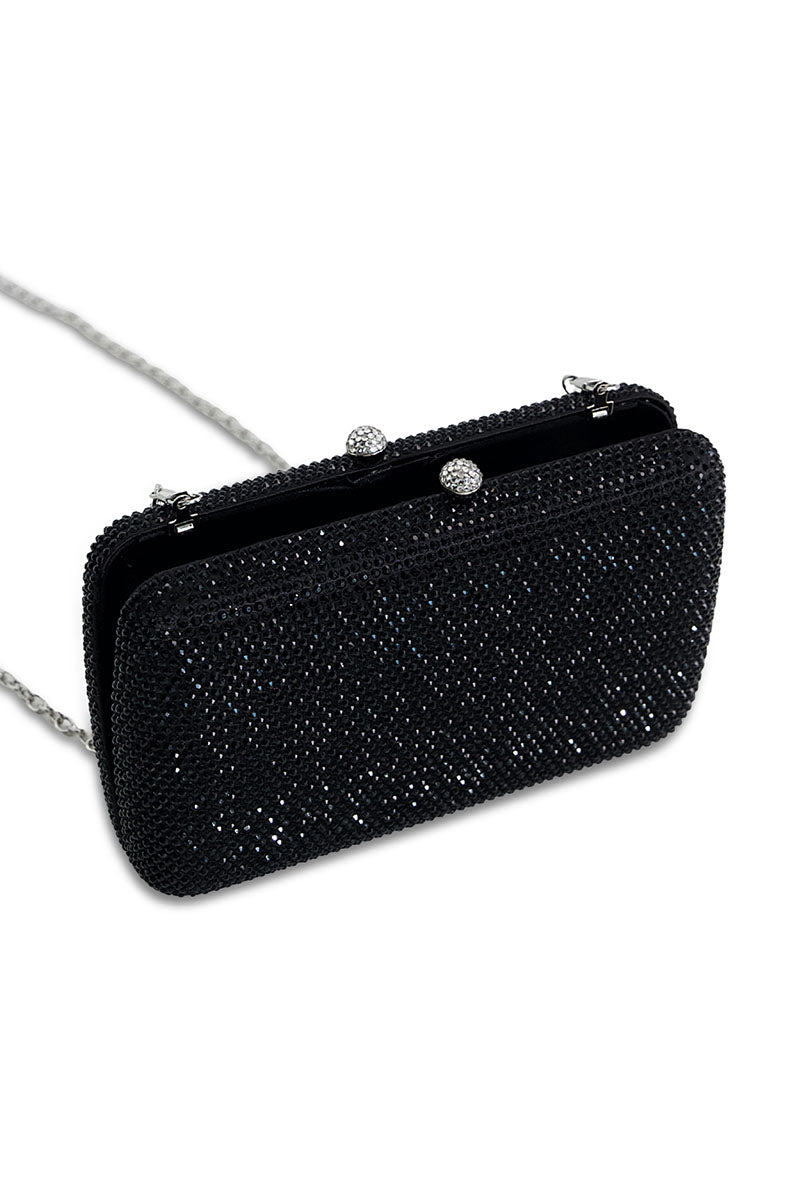 Black embellished clutch with long chain strap. Compact dimensions (4.8" H x 7.6" W) perfect for evening occasions or everyday carry.