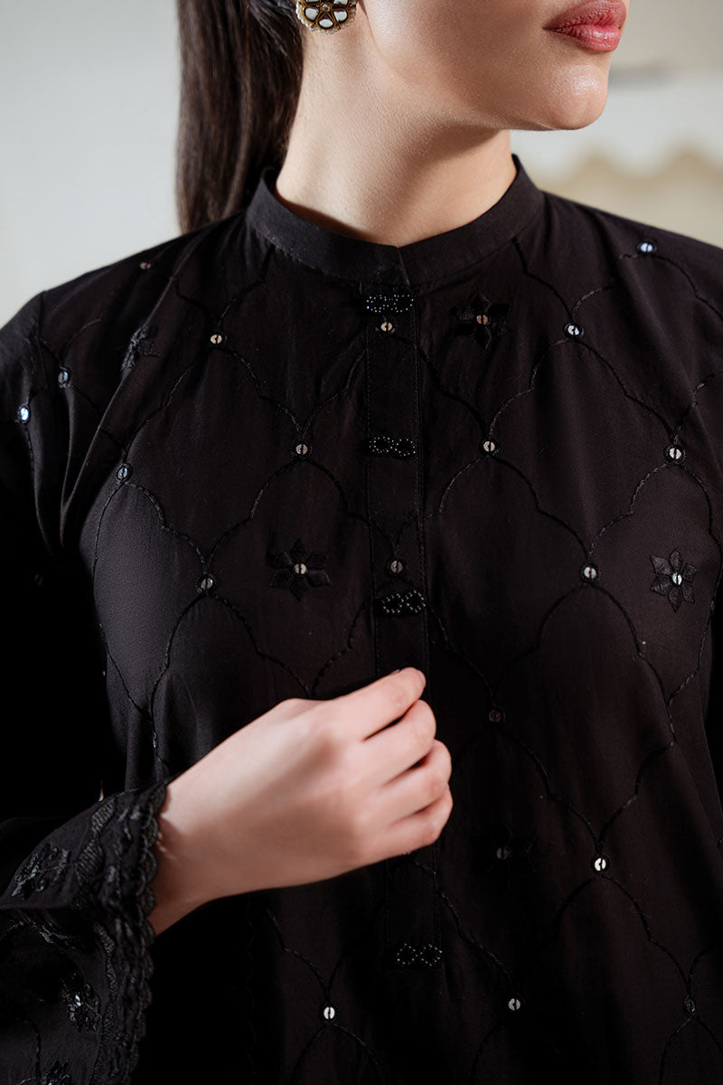 Elevate your wardrobe with the Noir Spell Embroidered Shirt, a sophisticated A-line design crafted from premium cambric fabric. This statement piece features intricate front embroidery on dyed fabric, complemented by a richly dyed back panel. The neckline is finished with a decorative ban and placket adorned with elegant tassels, while the sleeves showcase detailed embroidery paired with delicate lace accents. Perfect for those who appreciate refined craftsmanship and timeless style.
