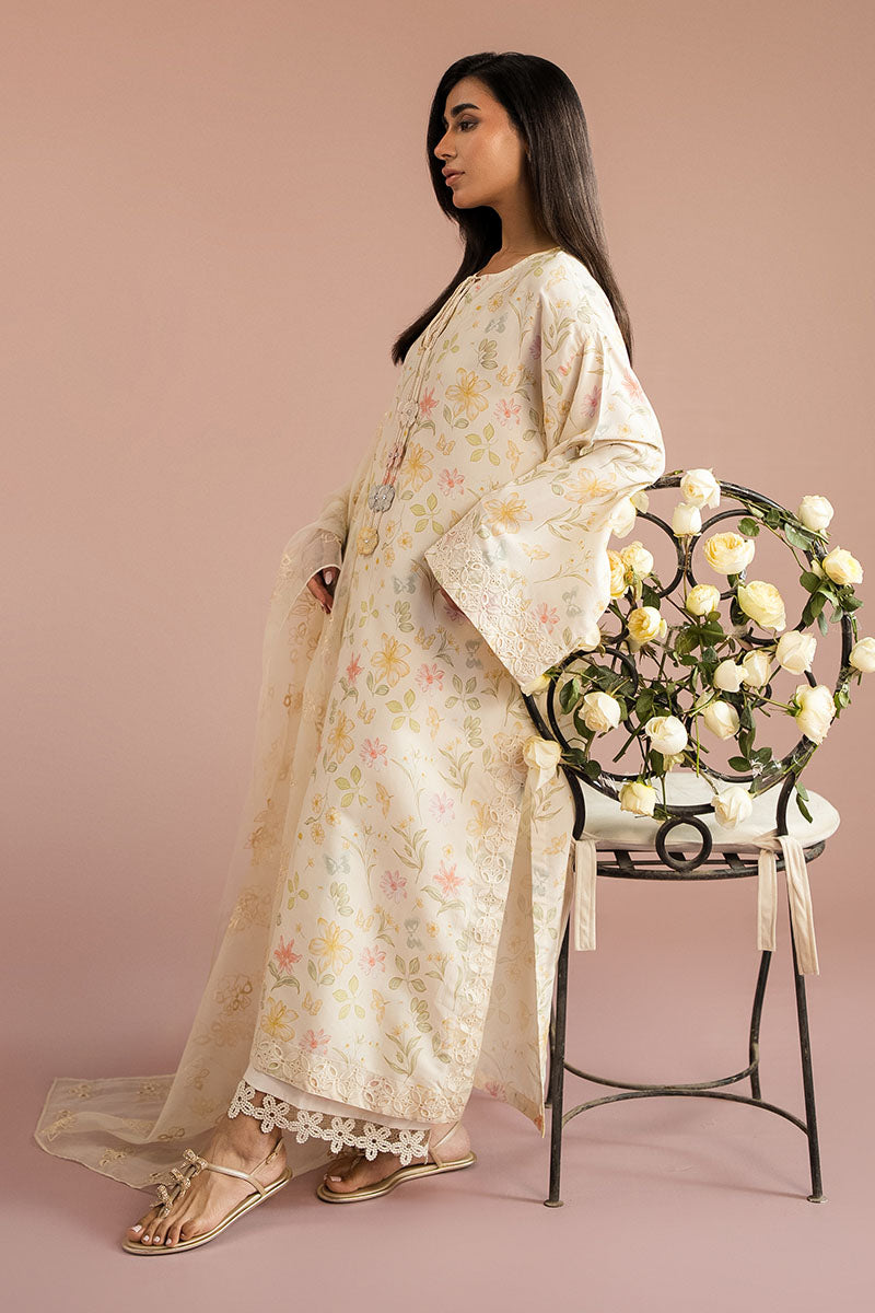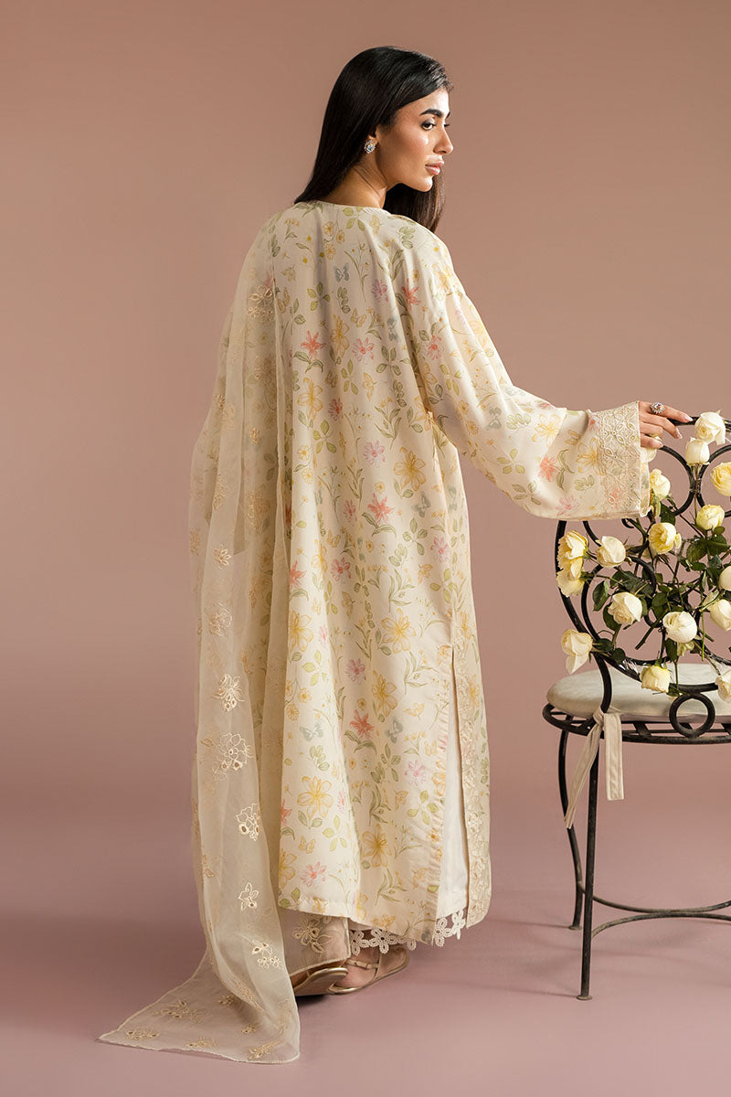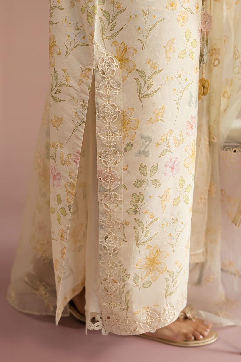 Elevate your wardrobe with this sophisticated two-piece ensemble featuring a luxurious silk shirt and complementary dupatta. The shirt showcases a relaxed silhouette with front and back printed designs, accented by intricate embroidered borders along the hem and side slits. A refined round neckline with decorative slit and tassel detailing adds elegance, while flared sleeves adorned with embroidery create graceful movement. The poly organza dupatta, expertly dyed and embellished with embroidery, completes this polished look. Perfect for occasions demanding understated luxury and refined craftsmanship.