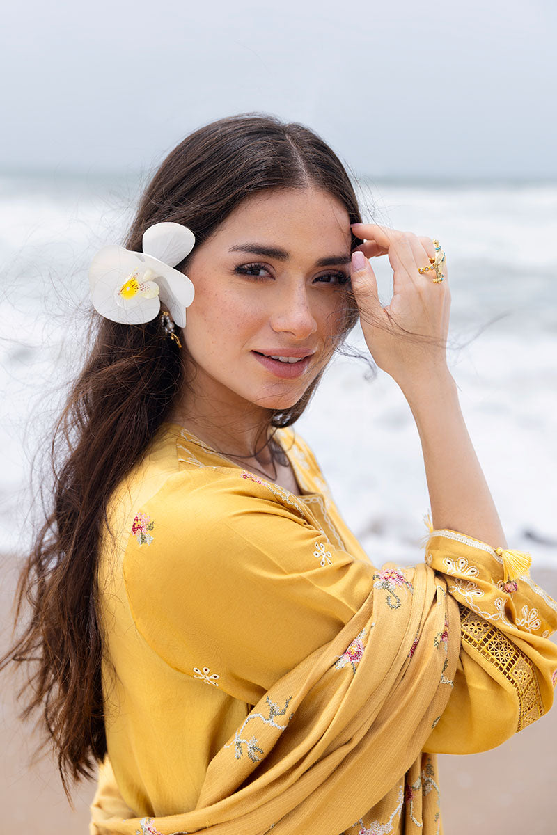 Elevate your wardrobe with this sophisticated three-piece ensemble featuring premium cotton satin with intricate embroidery adorning the front and sleeves, complemented by a dyed cambric trouser. The collection showcases masterful craftsmanship with a 60-inch embroidered patti that adds refined detail to the trouser, while the staple woolen dupatta features matching embroidery for a cohesive, polished look. Perfect for those who appreciate quality fabrics and expert needlework, this set combines comfort with timeless elegance for any occasion.