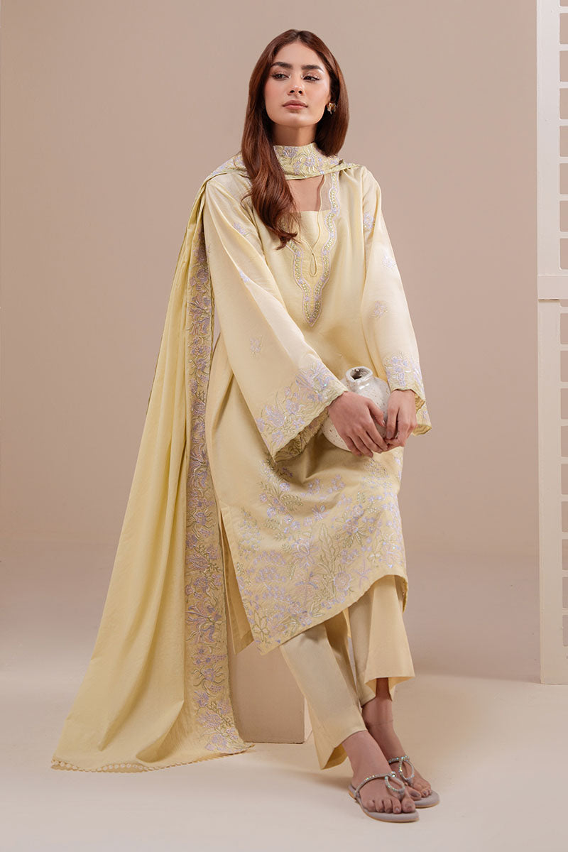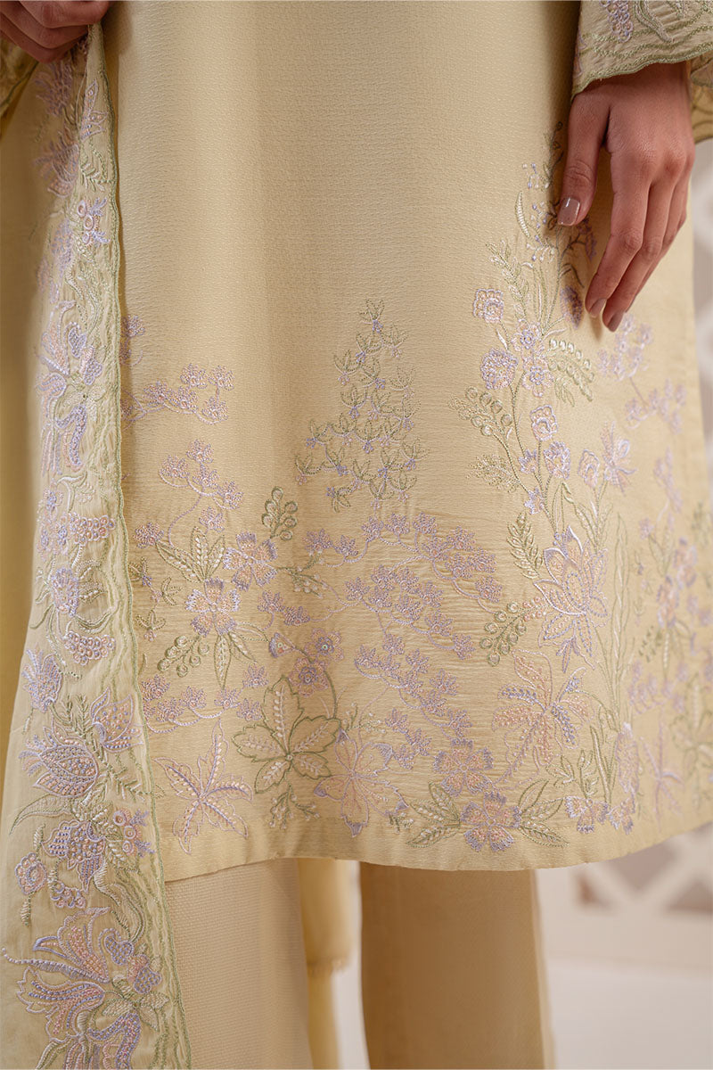 Introducing the Soft Buttercup 3-piece ensemble, a sophisticated collection designed for the discerning wearer. The A-line shirt features luxurious textured lawn with intricate front dyed embroidery and an elegantly embroidered neckline patch. Sleeves showcase detailed dyed embroidery adorned with delicate tassels for added dimension. The coordinating dobby dyed trouser offers refined tailoring and comfort. Complete the look with the lawn dupatta, beautifully dyed and embroidered with exquisite lace finishing. This thoughtfully curated set combines traditional craftsmanship with contemporary design, perfect for both formal occasions and elevated everyday wear.