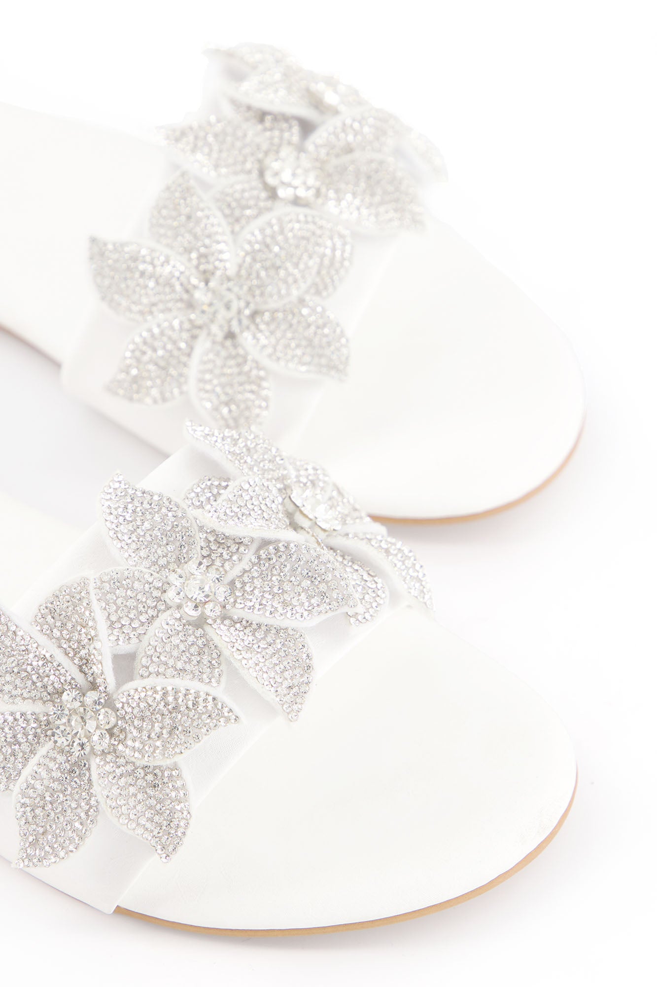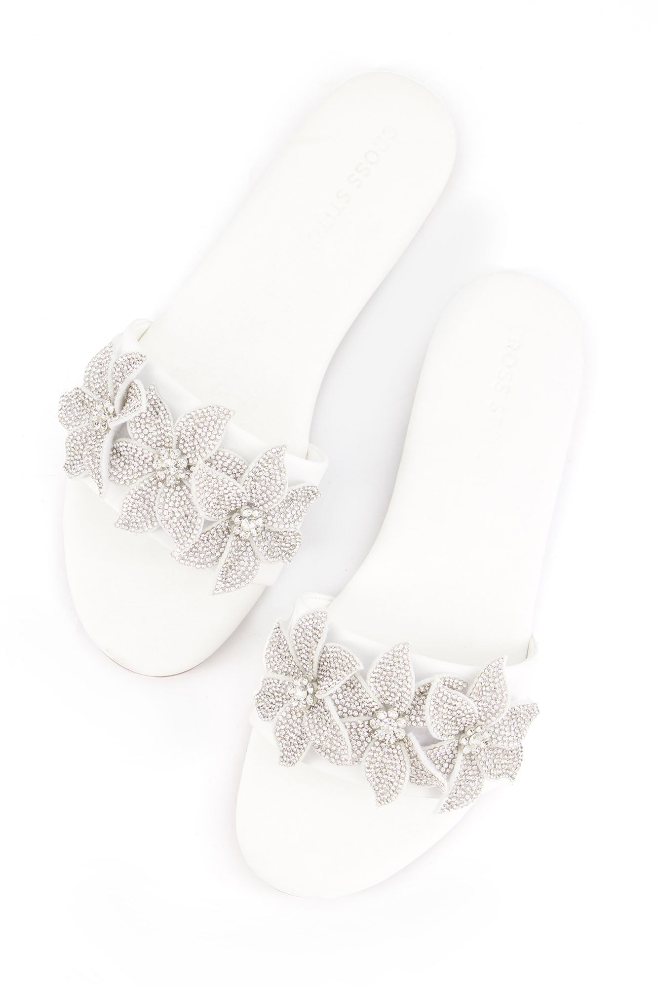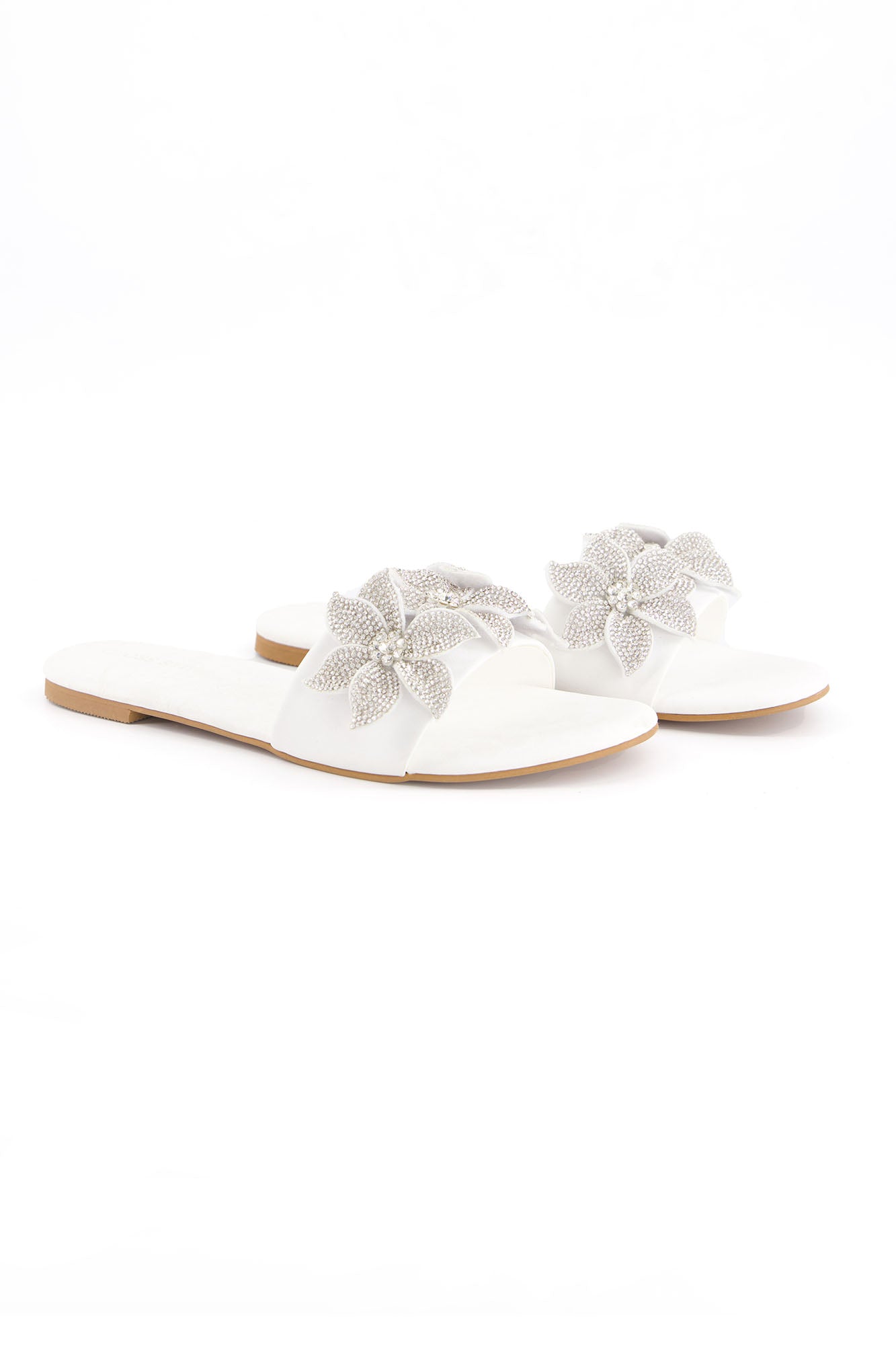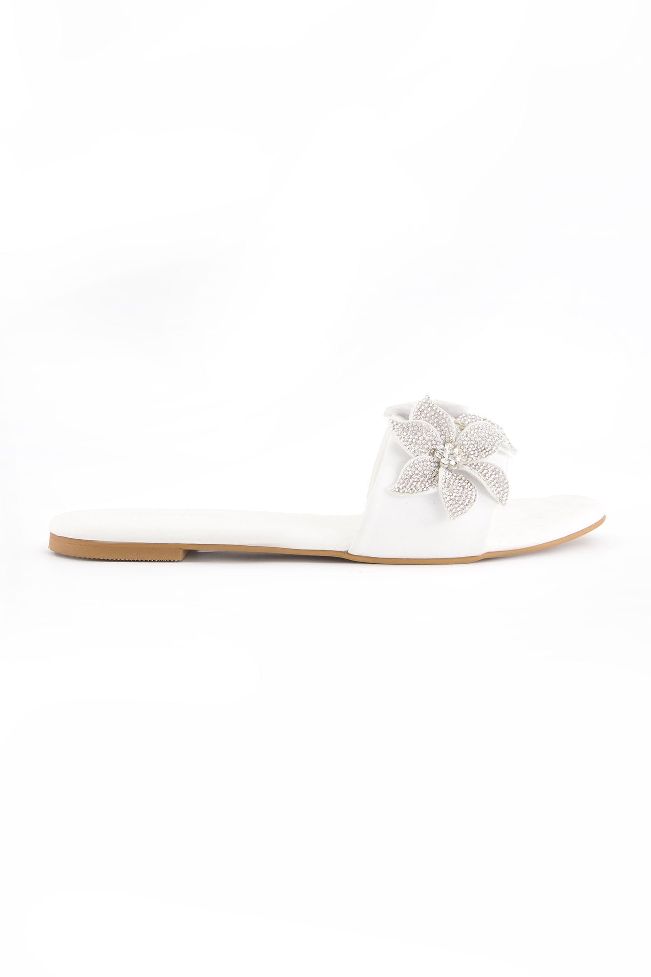 Designed with statement floral embellishments, these flats bring elegance and sparkle to a refined silhouette. The layered crystal floral design adds texture and a striking visual appeal. Crafted with a PU synthetic upper, the pair offers durability with a sleek finish. The padded insock provides comfort, while the custom sheet outsole ensures stability for everyday wear.