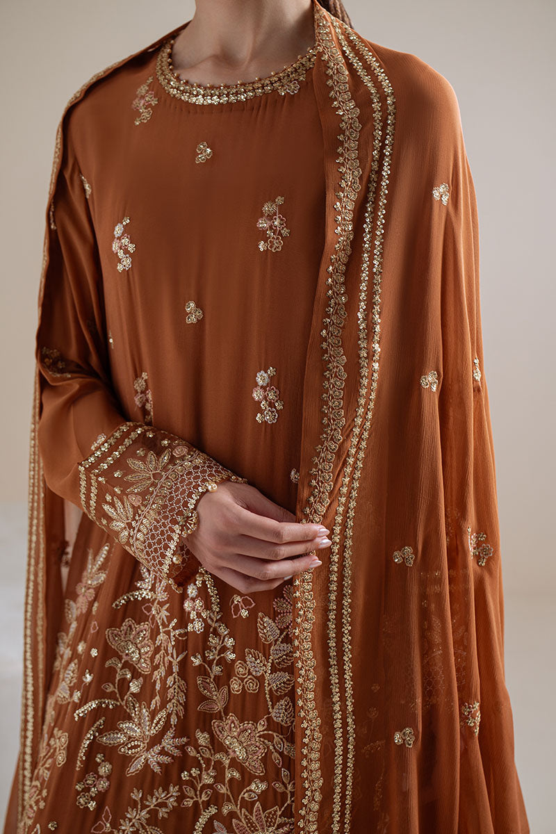 Elevate your wardrobe with this sophisticated four-piece ensemble crafted for refined elegance. The shirt features intricately embroidered chiffon across the front, back, and sleeves, complemented by premium embroidered patti detailing—80 inches adorning the front and back hem, 40 inches on the sleeves, and 60 inches along the placket for a polished finish. Paired with a luxurious silk-dyed slip and matching silk-dyed trouser for seamless comfort and drape. The ensemble is completed with an exquisitely embroidered chiffon dupatta that ties the look together. Perfect for special occasions, this suit combines traditional craftsmanship with contemporary design sensibilities.