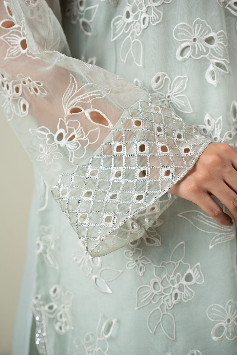 Elevate your wardrobe with the DAZZLING AQUA 3PC, featuring a regular organza shirt adorned with intricate front and back embroidery. The band collar with tasseling on the slit adds refined detail, while the sleeves showcase embroidered schiffli borders complemented by tassels. The silk trousers offer a luxurious feel with dyed fabric and schiffli embroidery along the culotte borders. Completing the set is an elegant organza dupatta, dyed and embroidered to enhance the ensemble’s sophisticated charm. Perfect for those who appreciate craftsmanship and style in every detail.