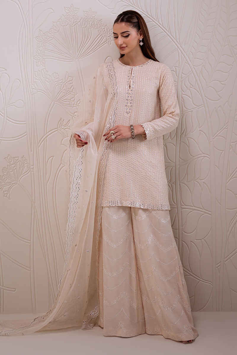 Elevate your wardrobe with this sophisticated three-piece ensemble featuring premium silk craftsmanship. The straight-cut shirt showcases intricate front embroidery and dyeing, complemented by a crew neck adorned with delicate adda work and embellished sleeves finished with traditional tasseling. The coordinating palazzo pants in embroidered silk offer graceful movement and refined elegance. Complete the look with the organza dupatta, beautifully embroidered and detailed with matching tassels. Perfect for formal occasions and celebrations, this collection combines timeless design with expert artisanal detailing.