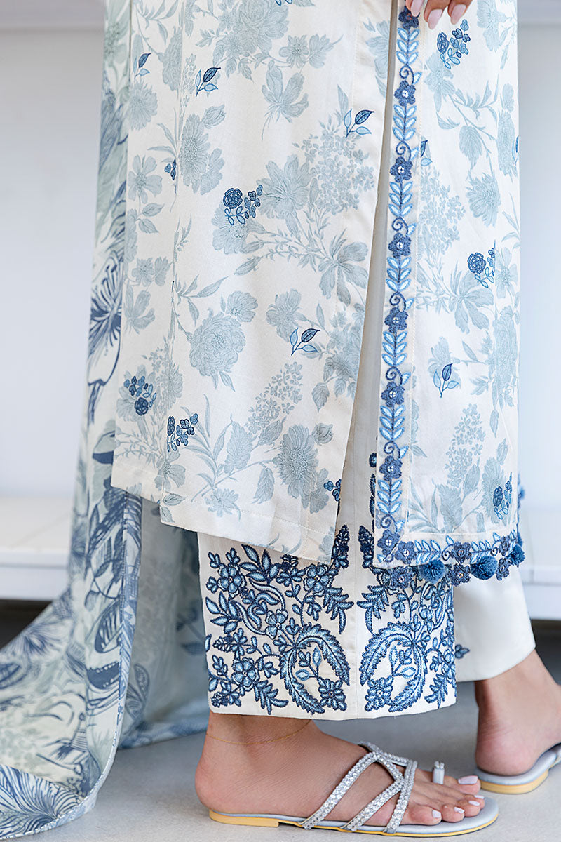 Whimsical Teal is a sophisticated three-piece ensemble crafted for refined elegance. The cotton satin shirt features intricate printed detailing with an embroidered patti adorning the placket, adding a refined focal point. Paired with cambric dyed trousers embellished with embroidered patches that echo the shirt's artistry. The viscose net dupatta, printed with complementary patterns, completes the look with graceful drape and movement. Each component is thoughtfully designed to work harmoniously, creating a cohesive outfit suitable for formal occasions and celebrations.