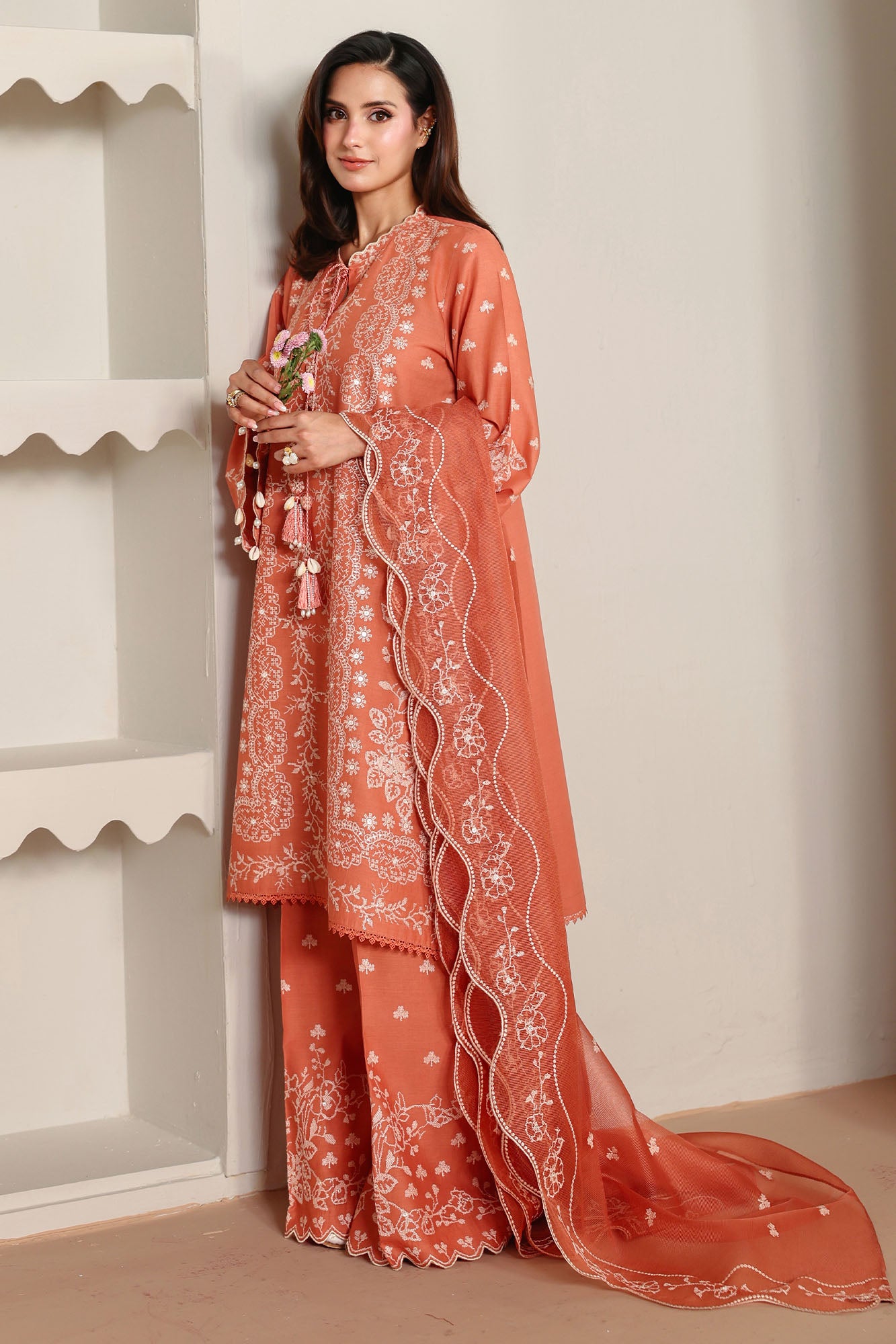 AMBER MIST is an elegant three-piece ensemble designed with soft warmth and refined detailing. The lawn shirt features an embroidered front and sleeves with a dyed back, creating a balanced blend of texture and simplicity. It is paired with a cambric embroidered trouser for a rich and polished look, and completed with a net embroidered dupatta that adds a delicate and graceful finish. A timeless design that beautifully combines subtle embroidery with modern sophistication.