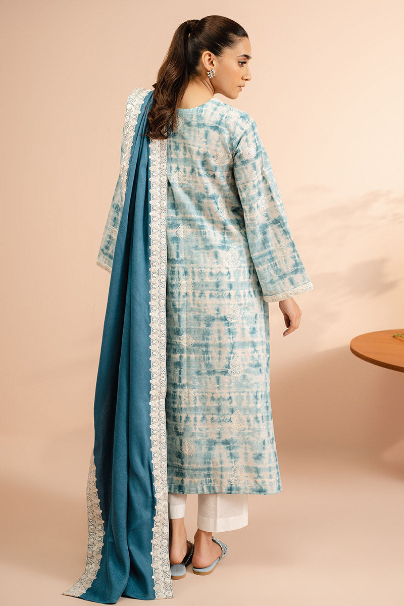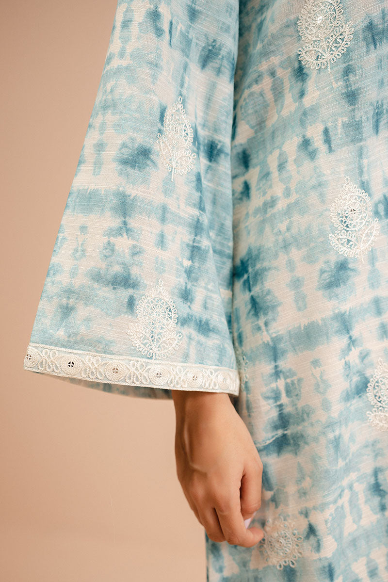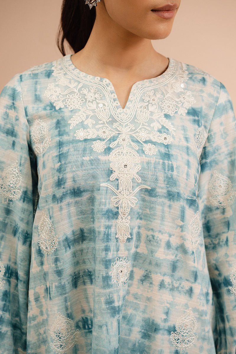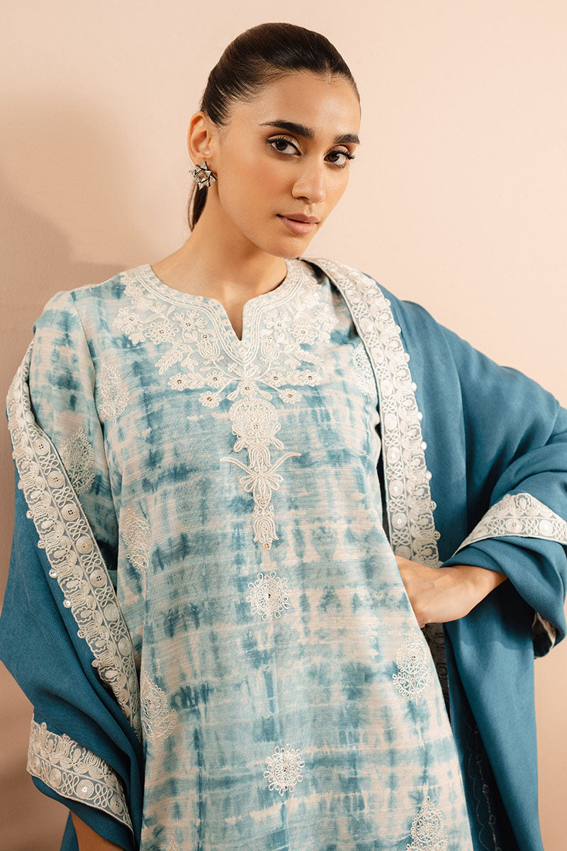 The AQUA MARINA-2PC is a stylish and versatile outfit that features an A-line khaddar shirt with a printed and embroidered front and back. The crew neck is embroidered and the sleeves have a flared, embroidered design. The matching staple woolen dupatta adds a touch of elegance with its beautiful embroidery.