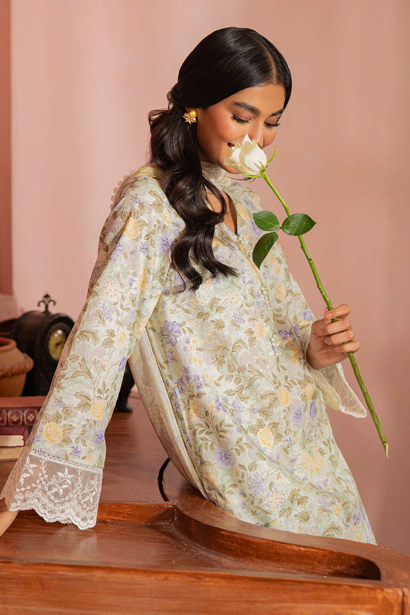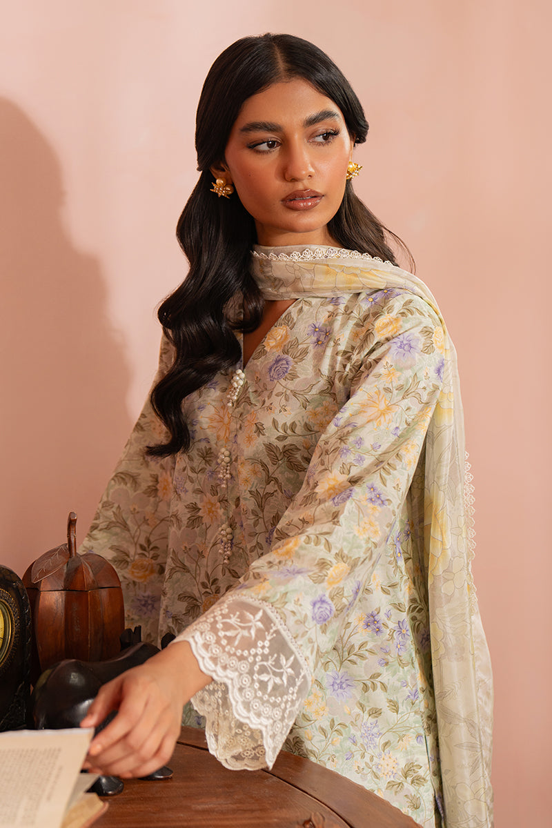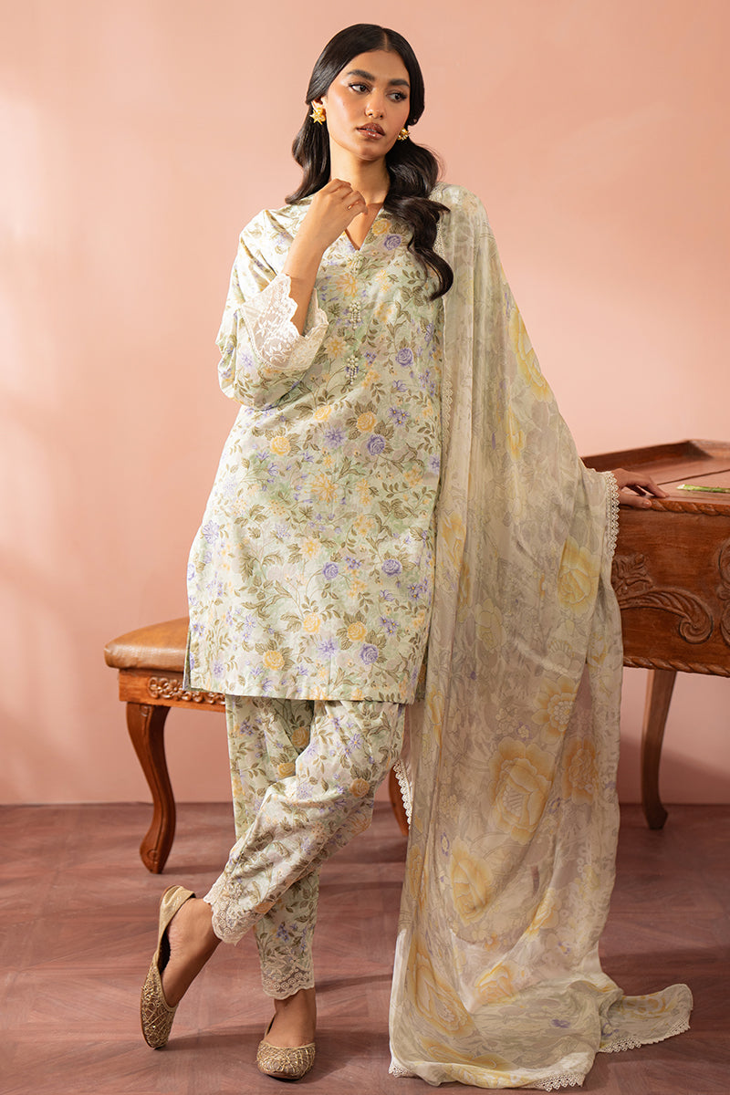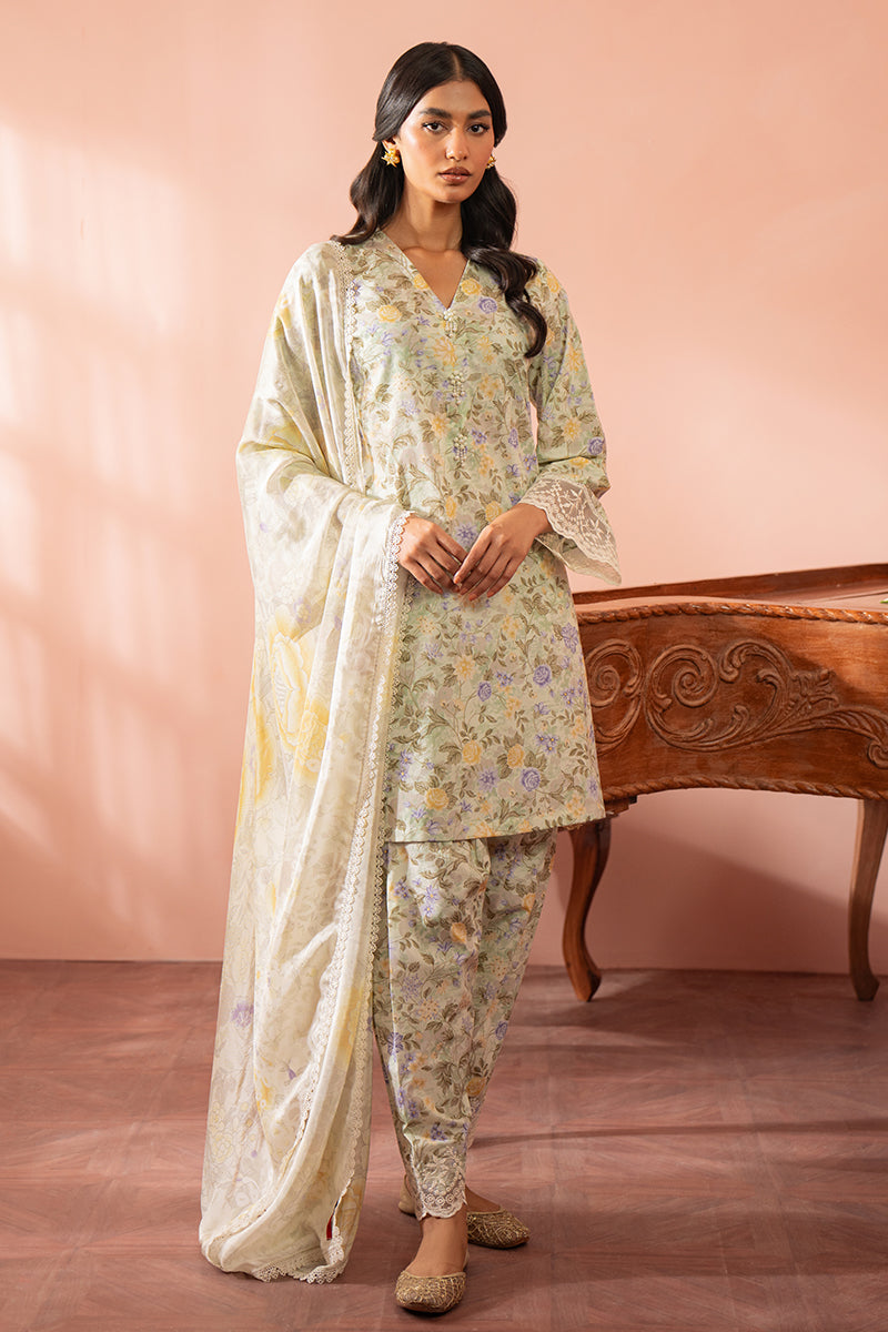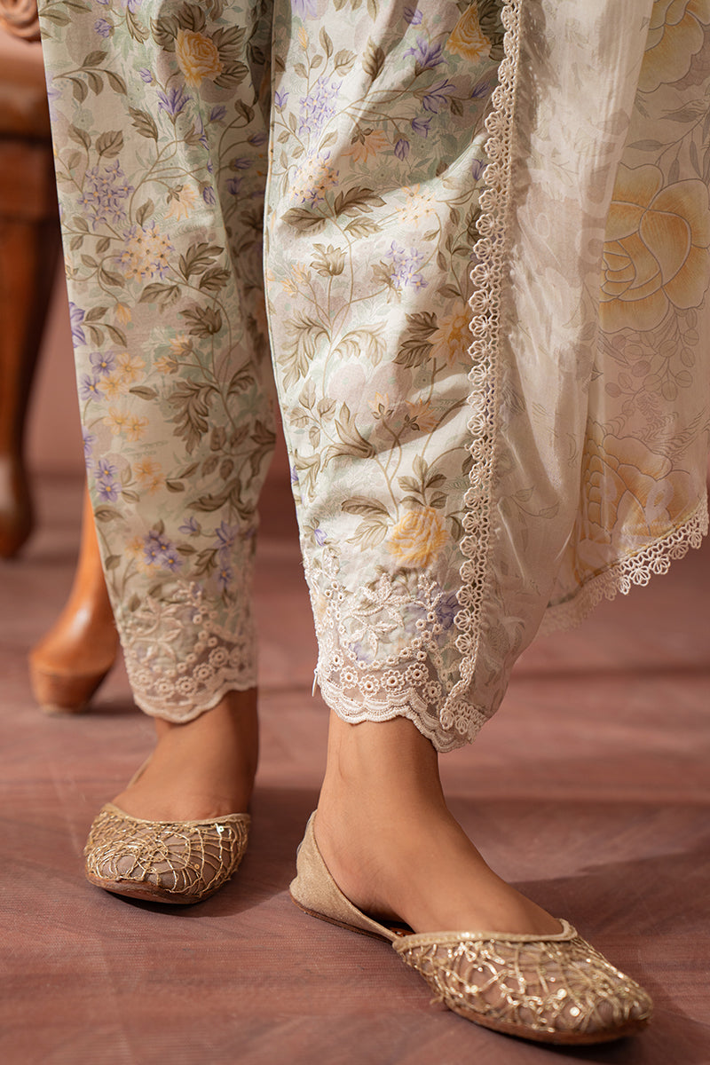 • This three-piece set features a printed cambric shirt with embroidered patti for a unique hem, along with a matching cambric trouser and a silk printed dupatta. Elevate your wardrobe with this stylish and versatile ensemble.