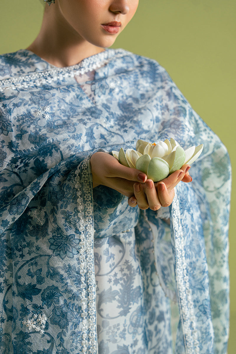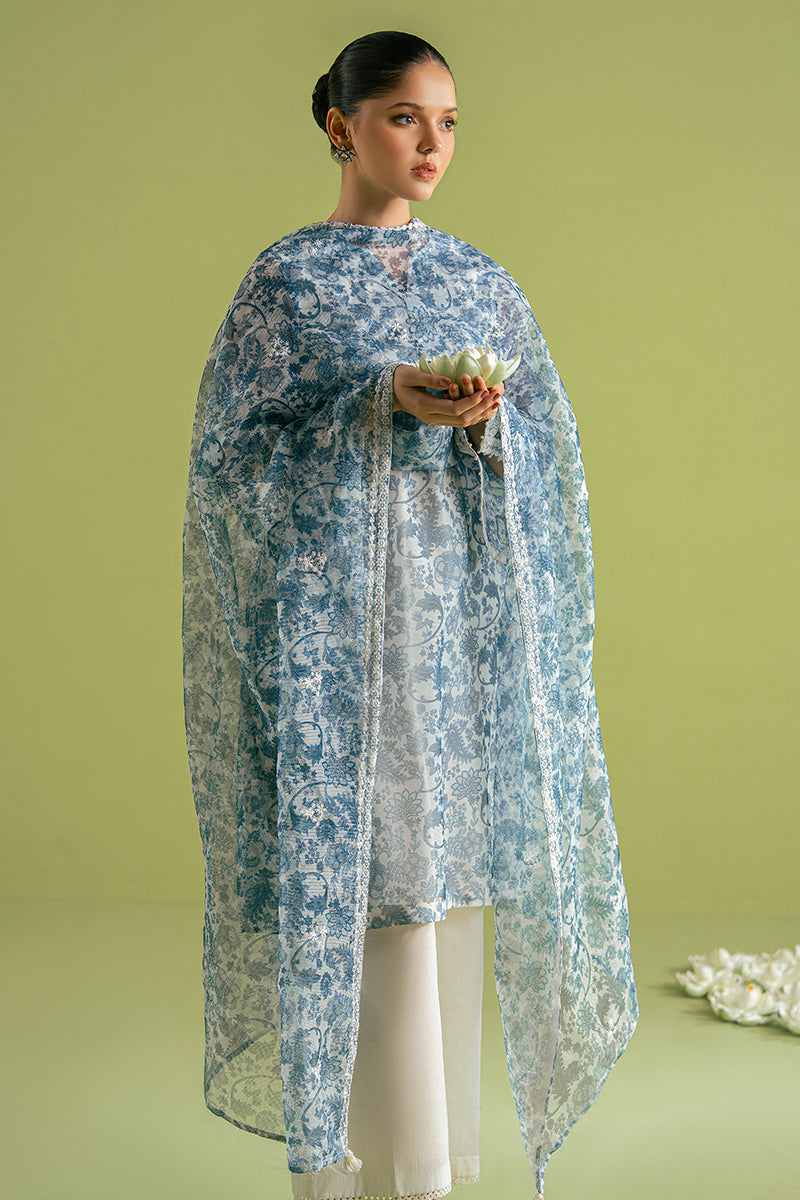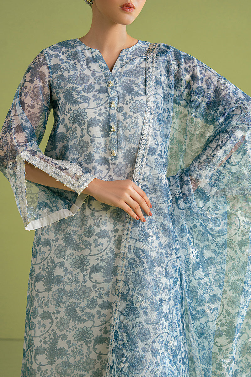 - Elevate your style with our CERAMIC BLUE-2 PC, which includes a printed, net straight shirt with lace hem and a beautifully embroidered dupatta. The tasseled details on the neckline and sleeves add an elegant touch. Made with rajjo net fabric, this set is perfect for any occasion.