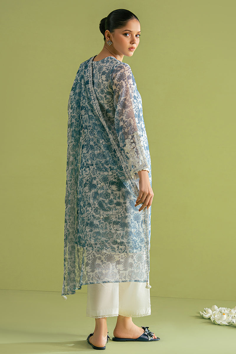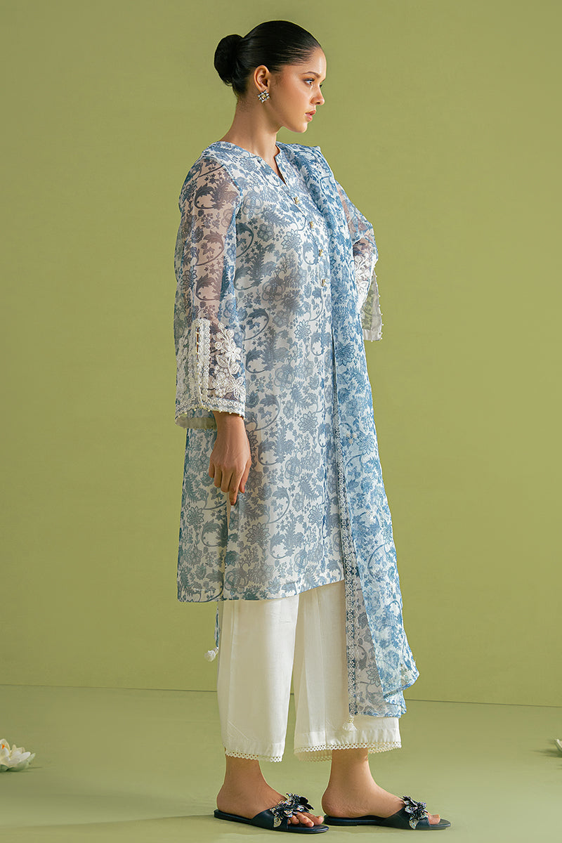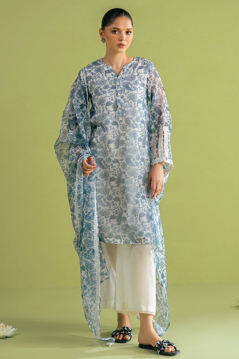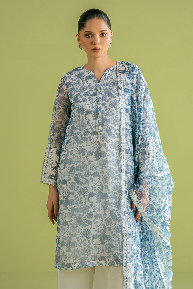 - Elevate your style with our CERAMIC BLUE-2 PC, which includes a printed, net straight shirt with lace hem and a beautifully embroidered dupatta. The tasseled details on the neckline and sleeves add an elegant touch. Made with rajjo net fabric, this set is perfect for any occasion.