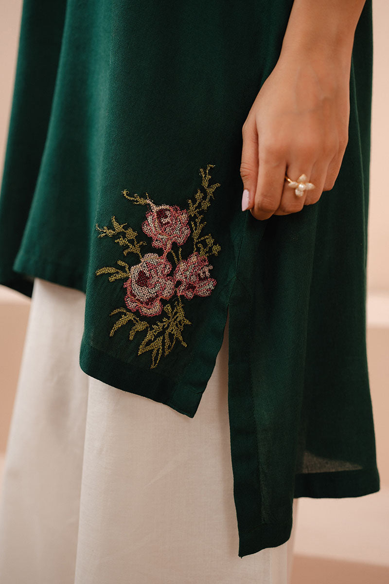 This linen shirt features a drop shoulder style and a boxy fit for a comfortable yet fashionable look. Both the front and back are plain dyed, while the neckline has a half band with a placket. The shirt also includes bat sleeves with an embroidered cuff for added detail.