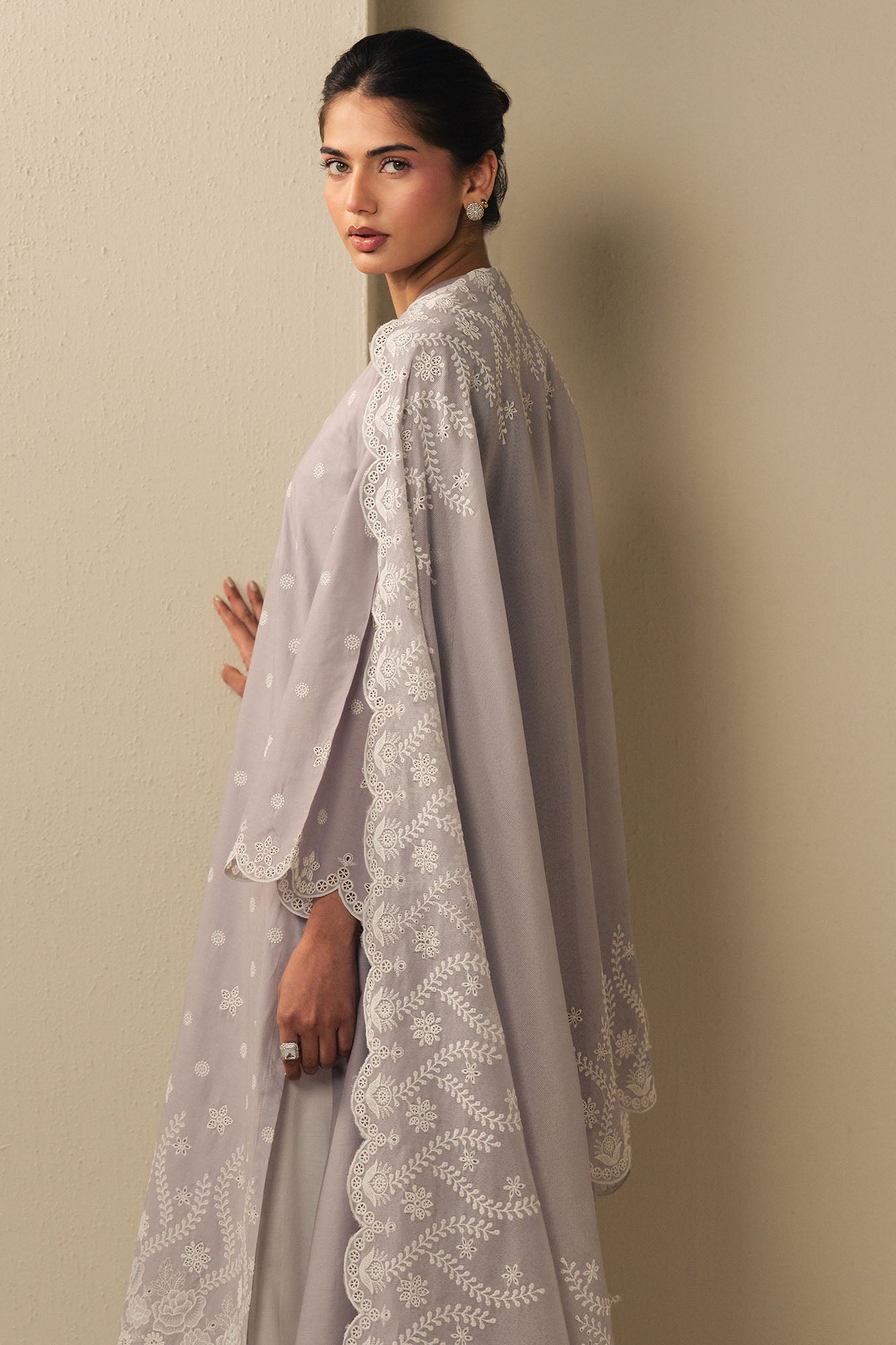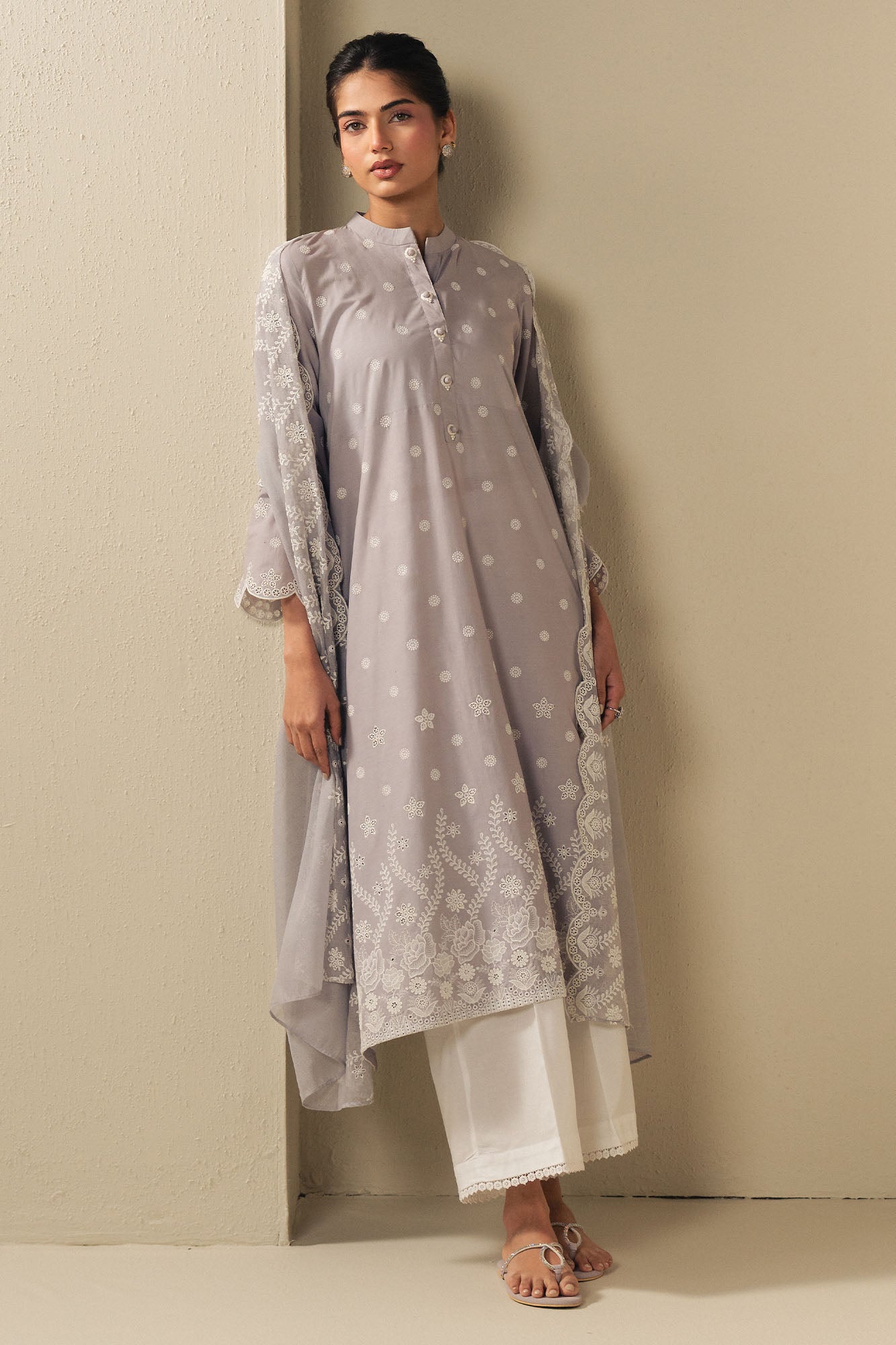 STYLE TIP Elegant A-line silhouette crafted from premium cambric fabric. Features intricate embroidery on the front with a beautifully plain dyed back for balanced sophistication. The ban neckline includes a functional placket, while flared sleeves showcase delicate embroidered detailing. Complemented by a stunning rajju net dupatta with matching embroidery work. Perfect for special occasions and celebrations, this piece combines traditional craftsmanship with contemporary style.
