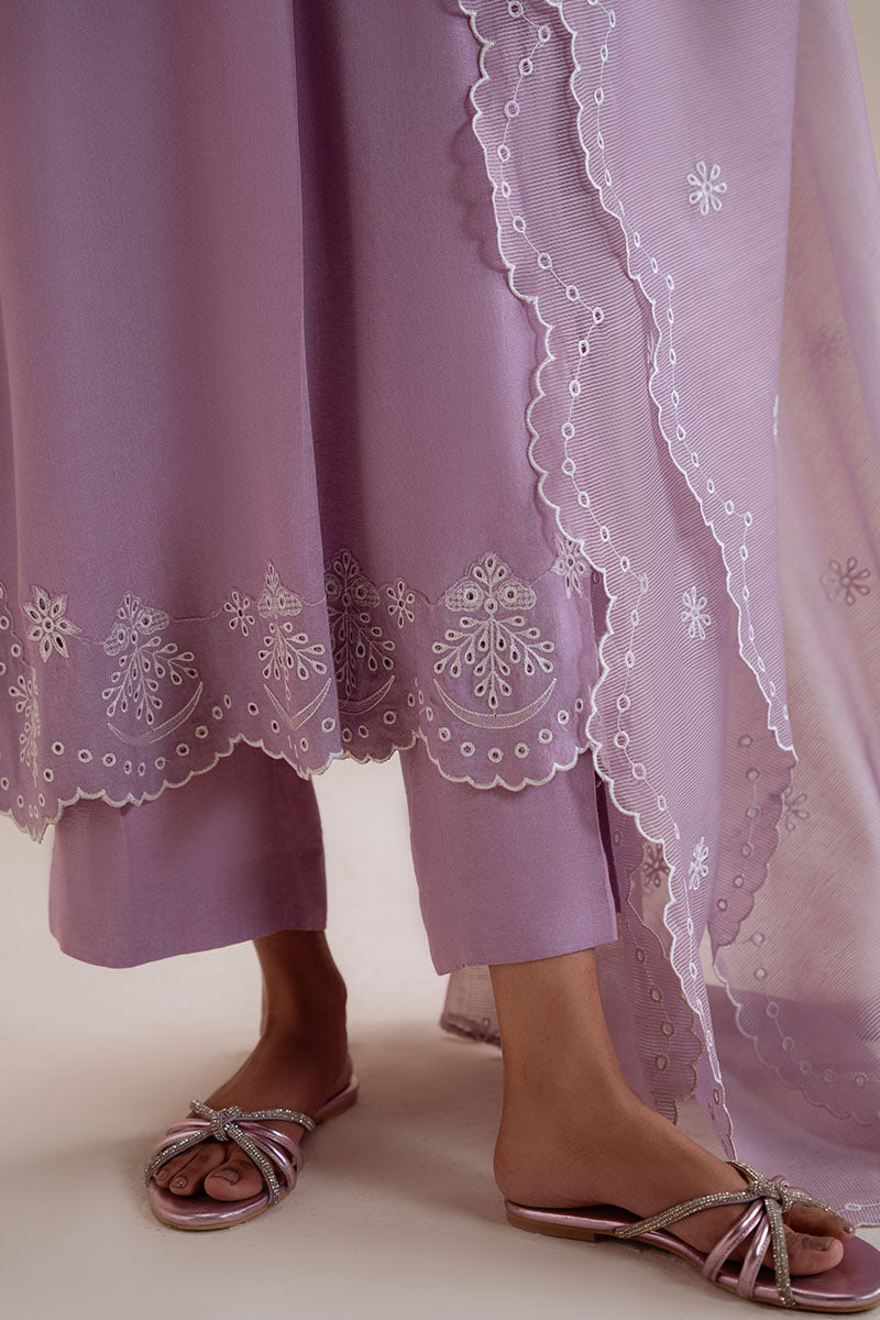 STYLE TIP Introducing the Lavender Reef 3-piece ensemble, a sophisticated collection designed for the discerning wearer. The loose-fit shirt features premium karandi fabric with an intricately embroidered front panel, while the back remains elegantly plain-dyed. A structured box-cut neckline band and embellished sleeves add refined detail. Paired with a straight-cut karandi trouser in matching dye, the set is completed by a delicate cotton net dupatta with coordinated embroidery. This thoughtfully curated ensemble balances comfort with understated luxury, perfect for both formal occasions and elevated everyday wear.