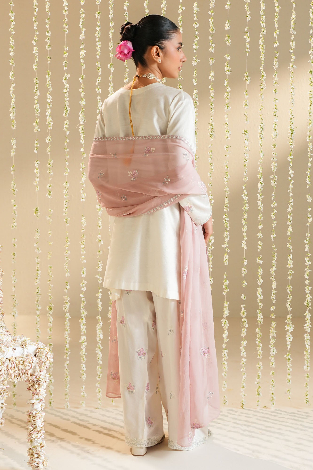 Discover elegance with the Pink Cloud 3-piece ensemble. This sophisticated set features a short cotton net shirt with intricate front embroidery and a dyed back, complemented by a crew neck adorned with a delicate slit and tassel detailing. The regular embroidered sleeves add refined texture, while the baggy raw silk shalwar trouser showcases beautiful dyed embroidery. Complete your look with the matching chiffon dupatta, expertly dyed and embellished. Perfect for celebrations and special occasions, this collection blends traditional craftsmanship with contemporary style.