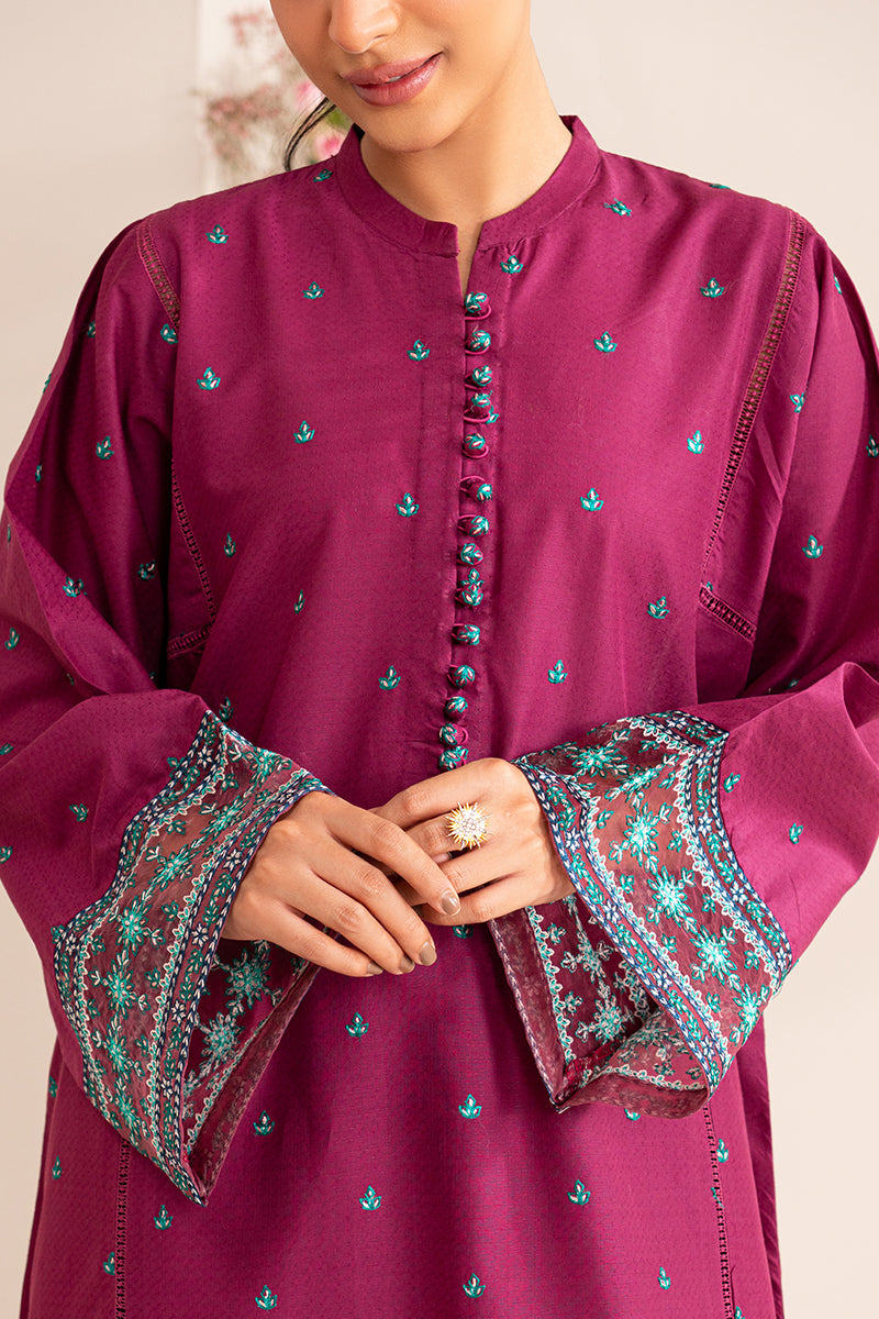 - Enhance your style with the PLUM REGALIA-2 PIECE EMBROIDERED LAWN SUIT. This dobby lawn kurta features front and sleeve embroidery, creating a sophisticated look. The neckline band with loop button adds a unique touch, while the tapered shalwar completes the ensemble. Elevate your fashion game with this stunning suit.