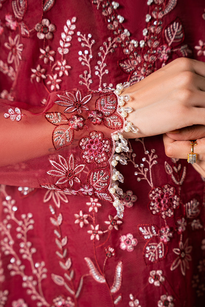 - This Garnet Glow 4PC suit features an expertly crafted organza shirt with intricate embroidery on the front, back, and sleeves, complemented by a 40" embroidered patti neckline and an 80" embroidered border along the shirt’s front and back hem. Paired with silk-dyed trousers and a matching silk slip, the ensemble is completed with a delicate organza dupatta, also adorned with detailed embroidery. Designed for elegance and comfort, this suit offers a refined blend of texture and craftsmanship perfect for special occasions.