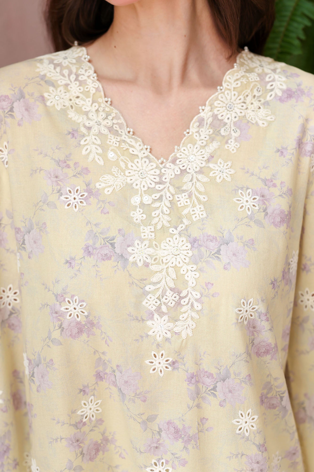 ORCHID FLARE is a sophisticated three-piece ensemble designed for a striking and elegant appearance. The lawn printed and embroidered shirt features a beautifully detailed front and sleeves with a printed back, elevated by an embroidered neckline. It is further enhanced with 40" embroidered patti on both hem and sleeves for added richness. Paired with a cambric printed trouser for everyday comfort and a silk printed dupatta that adds a luxurious finishing touch. A perfect fusion of intricate detailing and modern elegance.