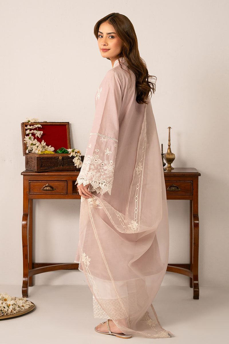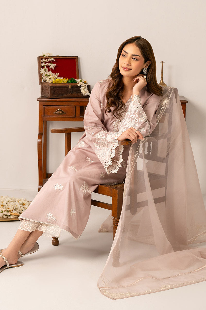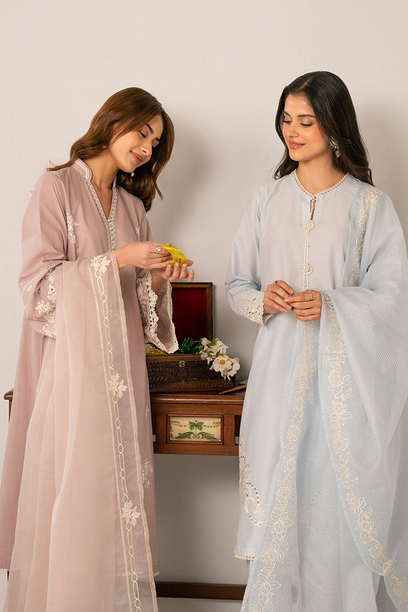 This elegant 2-piece set includes a straight shirt and a poly organza dupatta. The front of the shirt is embroidered with lace on the hem and side slits, while the back is dyed for a sleek finish. The flared sleeves feature delicate lace embroidery, and the half-standing band neckline is adorned with lace and tassels. Perfect for adding a touch of sophistication to any outfit.