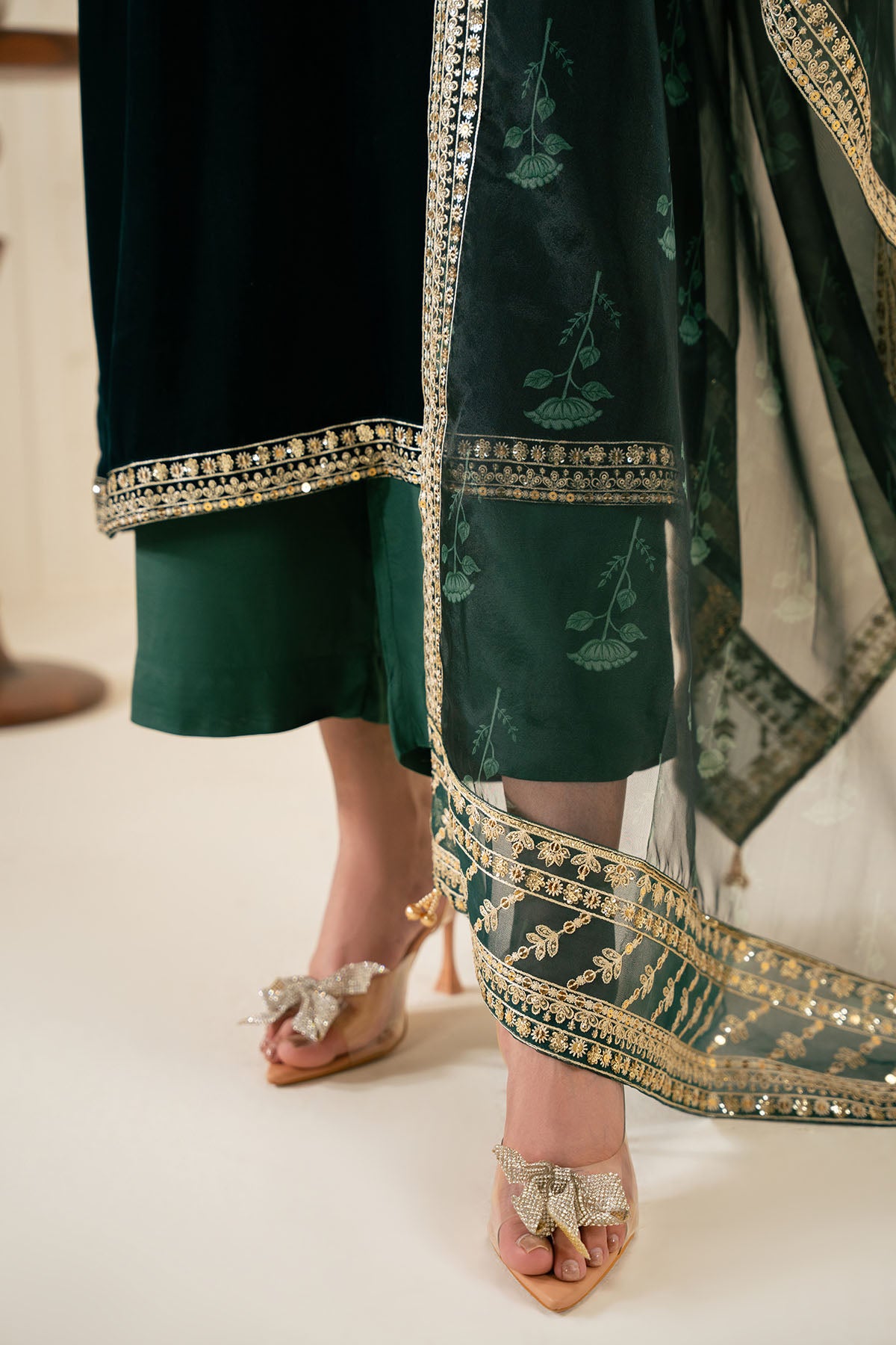 This elegant three-piece set features a loose-fit velvet shirt with front dye and intricate embroidery on the hem, complemented by a dyed back and a crew neckline adorned with embroidered button details. The flared sleeves showcase delicate embroidery with tassel accents, enhancing its sophisticated charm. Paired with silk-dyed culotte trousers, this ensemble offers a refined silhouette. Completing the look, an organza dupatta with exquisite embroidery adds a touch of ethereal grace, perfect for formal occasions or stylish gatherings.