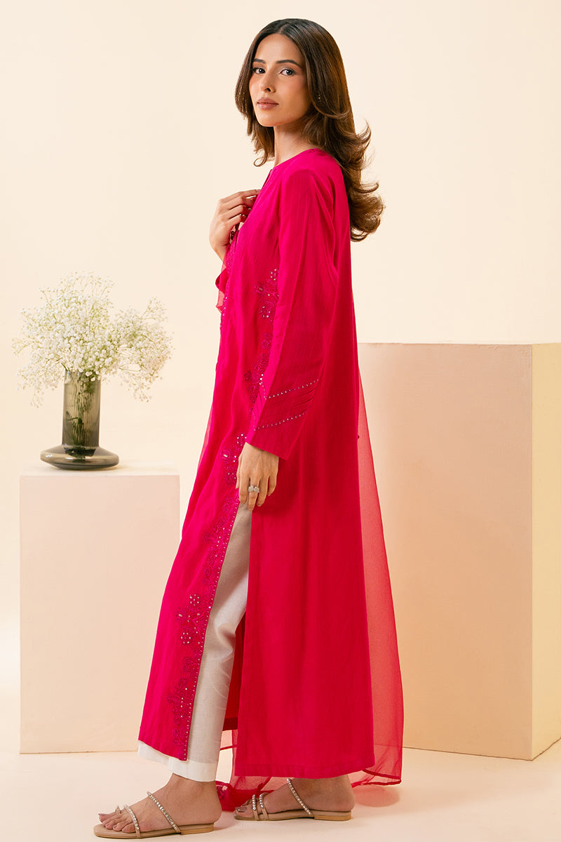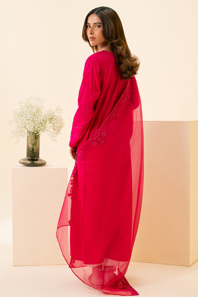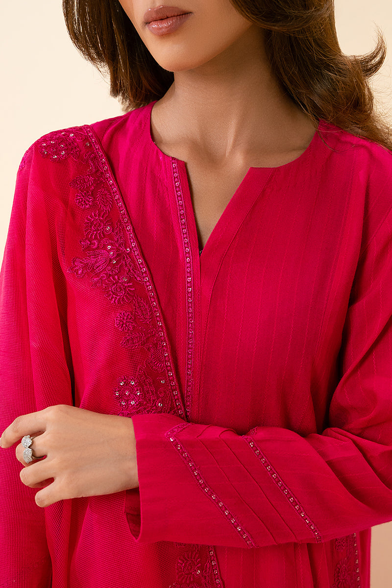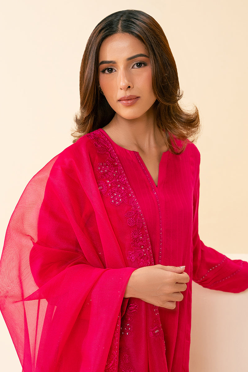 - The CHIC FUCHSIA-2PC (SHIRT & DUPATTA) is designed for a sophisticated and elegant look. The straight shirt, made of linen, features intricate embroidered side panels and a round neck with placket. The sleeves are detailed with embroidery and pin tucks, adding an extra touch of style. The rajjo net embroidered dupatta completes the look, making it a must-have for any fashion-forward individual.