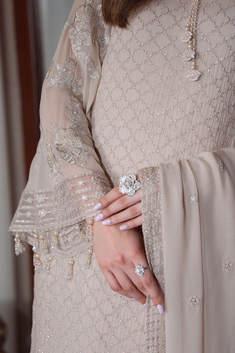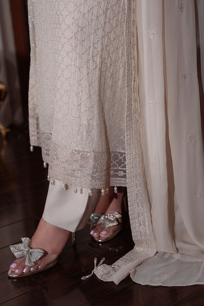 DUNE GRACE presents a sophisticated three-piece ensemble crafted for refined elegance. The shirt features intricately embroidered chiffon across the front, back, and sleeves, complemented by an 80-inch embroidered patti adorning the hem and a 40-inch embroidered patti detailing the sleeves. The coordinating chiffon dupatta showcases matching embroidery for a cohesive aesthetic. Complete the look with the silk-dyed trouser and slip, both expertly finished for comfort and drape. This collection exemplifies masterful craftsmanship, blending traditional embroidery techniques with premium fabrics to create a versatile piece suitable for both formal occasions and elevated everyday wear.