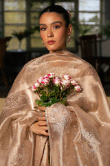 - Elevate your style with our SUNSET BLUSH-3 PC set. The straight shirt features intricate zari work and embellished tassels, while the round neck is adorned with pearl detailing. The dupatta boasts stunning zari embroidery, and the culottes silk trouser completes the look with its elegant embroidery.