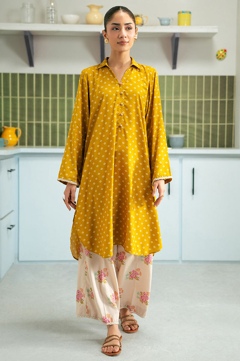 This elegant two-piece set features a stylish A-line shirt with a front print, band collar with a slit neckline, and regular sleeves for a refined silhouette. Complementing the shirt are linen culottes pants with a subtle print, offering breathability and comfort. Designed for effortless sophistication, this ensemble blends contemporary style with everyday ease.