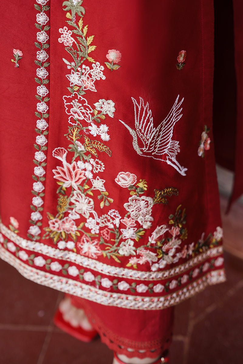 RUBY WHISPER is a high-quality garment made of 100% cotton satin, featuring exquisite front and back embroidery. The cotton satin sleeves are also beautifully embroidered and have a delicate embroidered patti on the shirt hem. The trouser is made of Cambric and is also dyed to match the shirt, while the dupatta is a stunning printed piece.